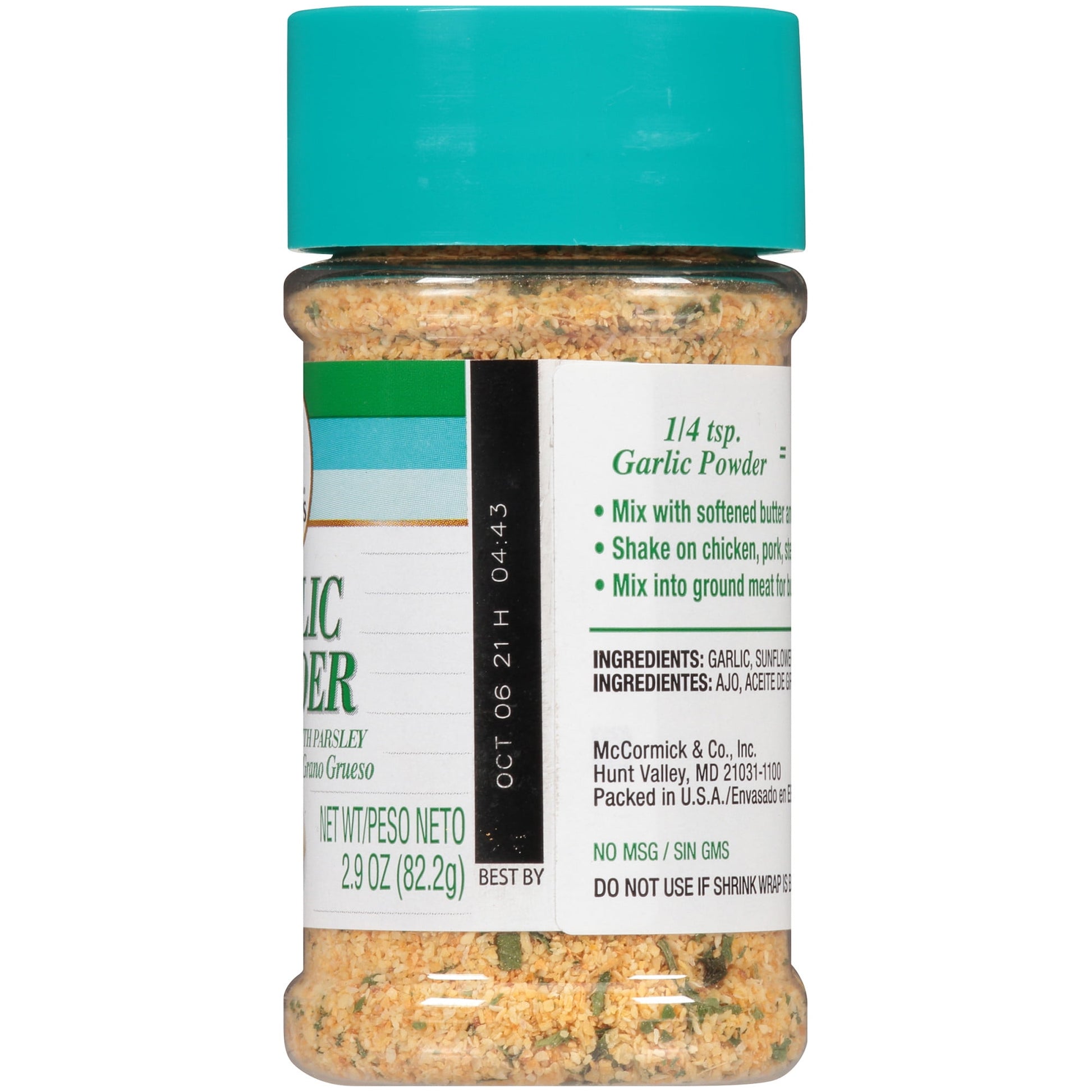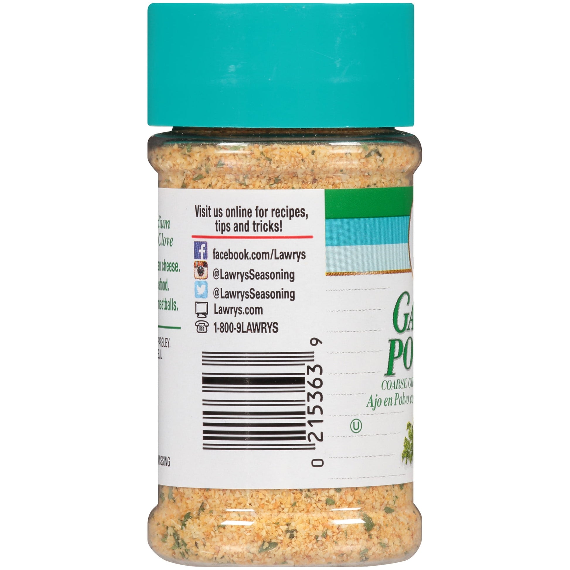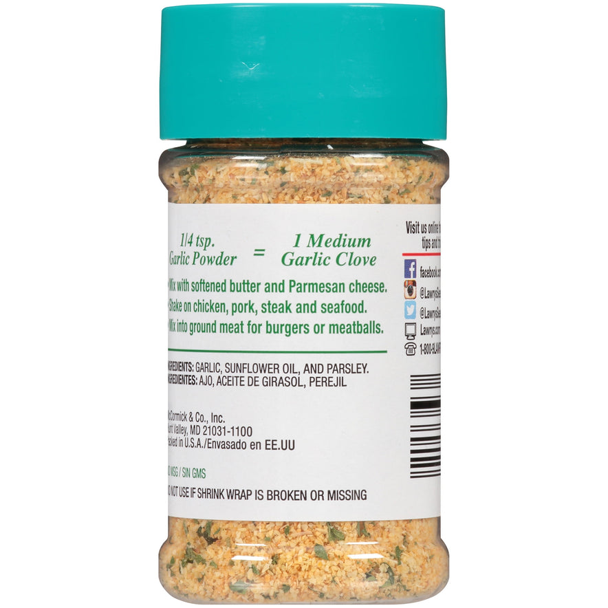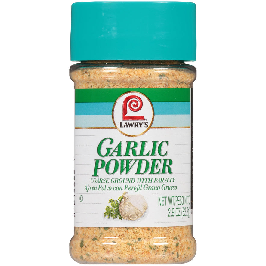 With coarse ground garlic and just a touch of parsley, Lawry’s Garlic Powder Coarse Ground with Parsley is a versatile kitchen staple, perfect for adding a delicious pop of flavor to a variety of recipes. Now you can enjoy garlic taste without the mess and short shelf life of garlic cloves.This convenient, tasty powder is ideal for soups, and you can always add a pinch when you’re cooking vegetables. Simply use ¼ teaspoon of garlic powder in place of one medium clove to easily season meats, stews and more. It’s also a nice touch on top of hot buttered rolls. This Lawry's® Garlic Powder is in a Plastic bottle that is 2.9 ounces. Store this shelf-stable item at an ambient temperature.
