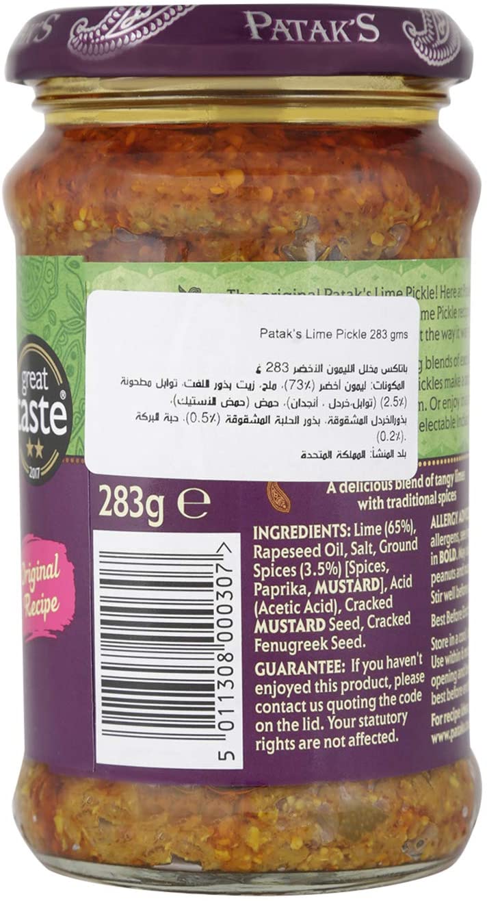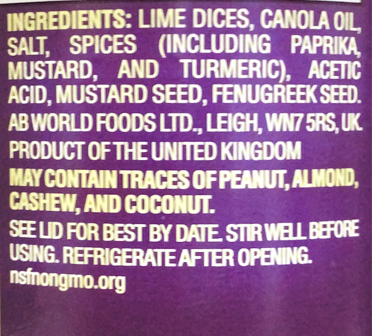 INGREDIENTS: LIME DICES, CANOLA OIL, SALT, SPICES (INCLUDING PAPRIKA, MUSTARD, AND TURMERIC), ACETIC ACID,MUSTARD SEED, FENUGREEK SEED.