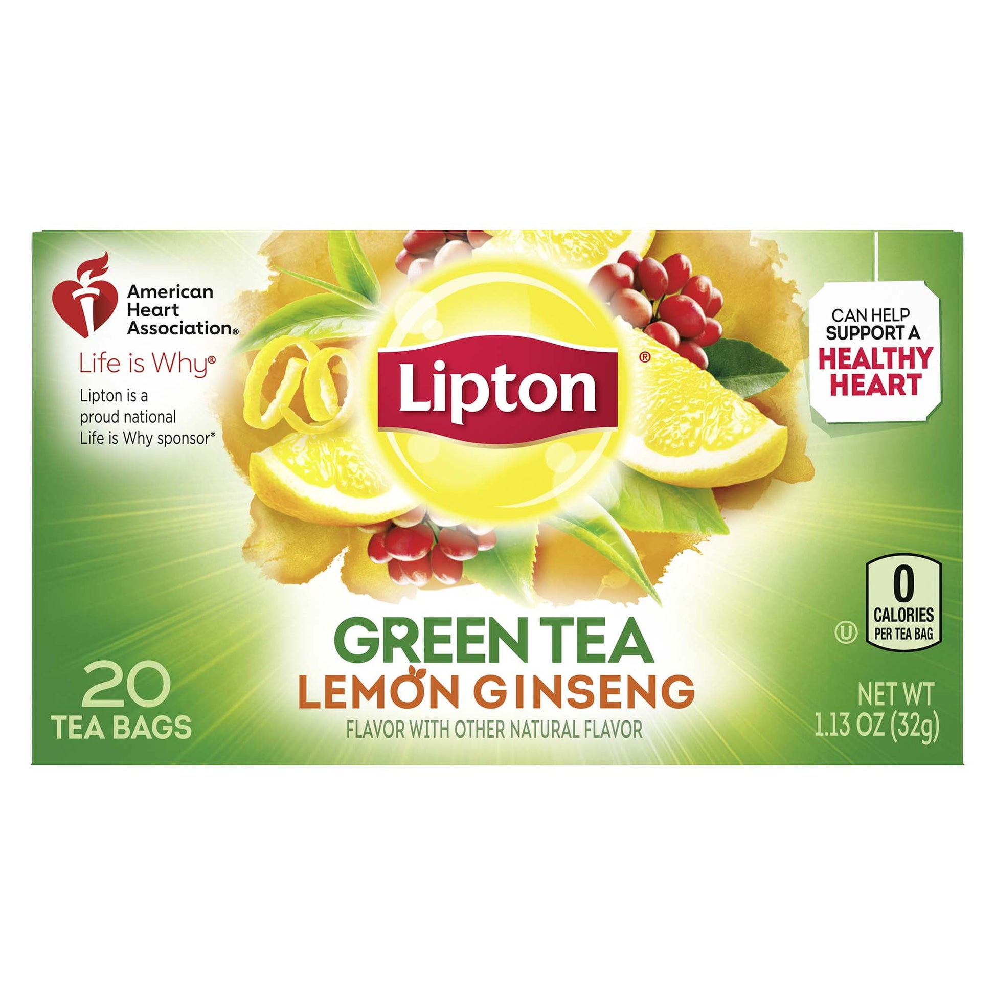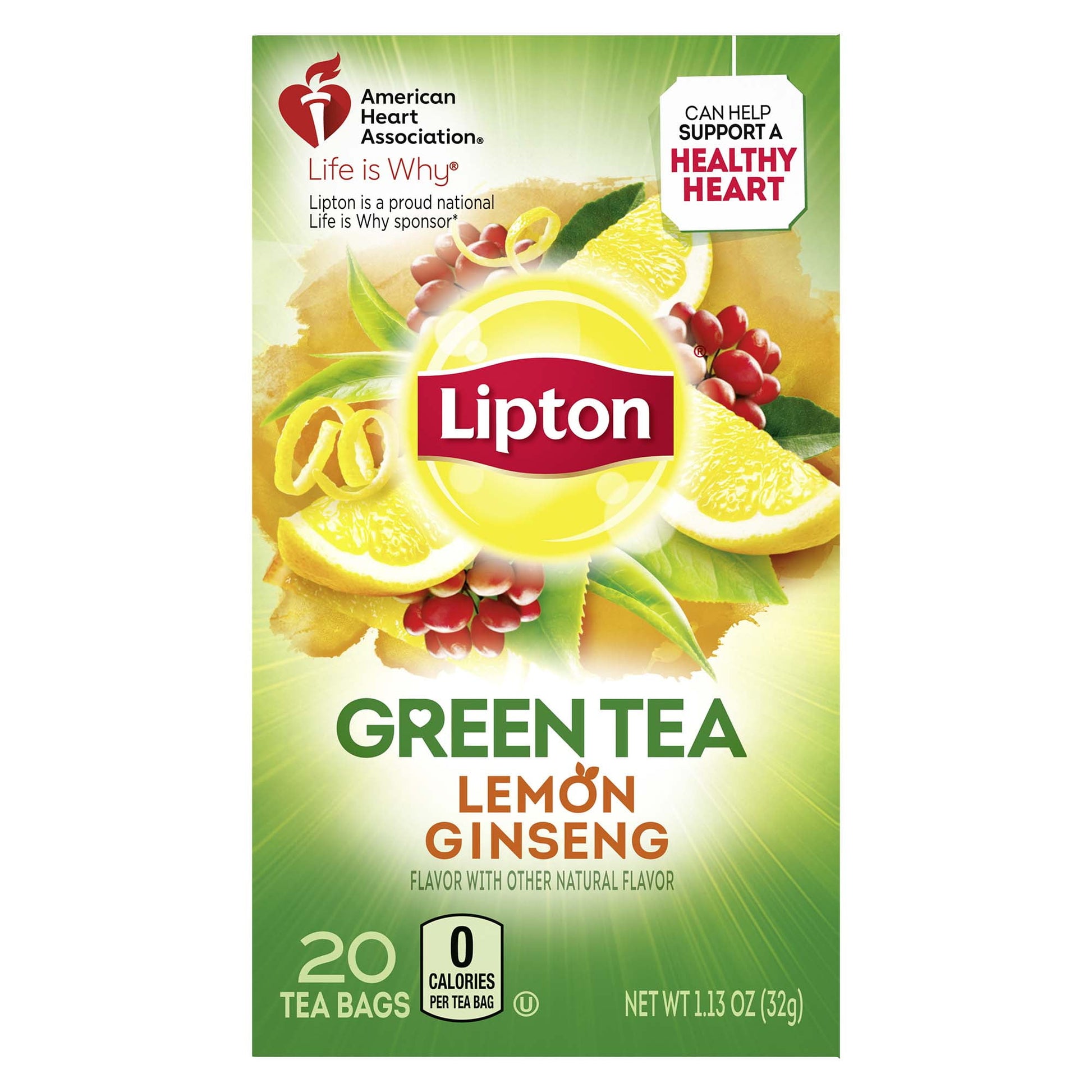 Thomas Lipton was a man on a mission - to share his passion for tea around the world. He believed that everyone deserved high quality, great tasting tea. And over 120 years later, that belief is still what drives us - inspiring more flavors, more varieties and more love than ever before. All our tea bags are 100% sustainably sourced, which translates into ensuring decent wages for tea farmers around the world together with access to quality housing, education and medical care. Your tea is their brighter future. Drinking unsweetened Lipton Green Tea can help support a healthy heart.** It's also a delicious way to hydrate so grab a cup today. And tomorrow. And the next day! **Unsweetened Lipton Lemon Ginseng Green Tea contains about 130mg of flavonoids per serving, no calories, no added sugars and it is 99.5% water.