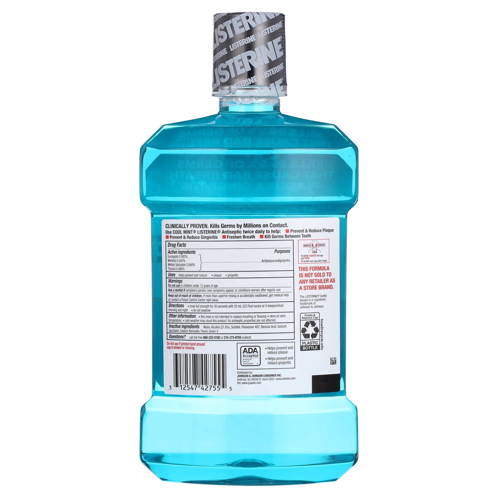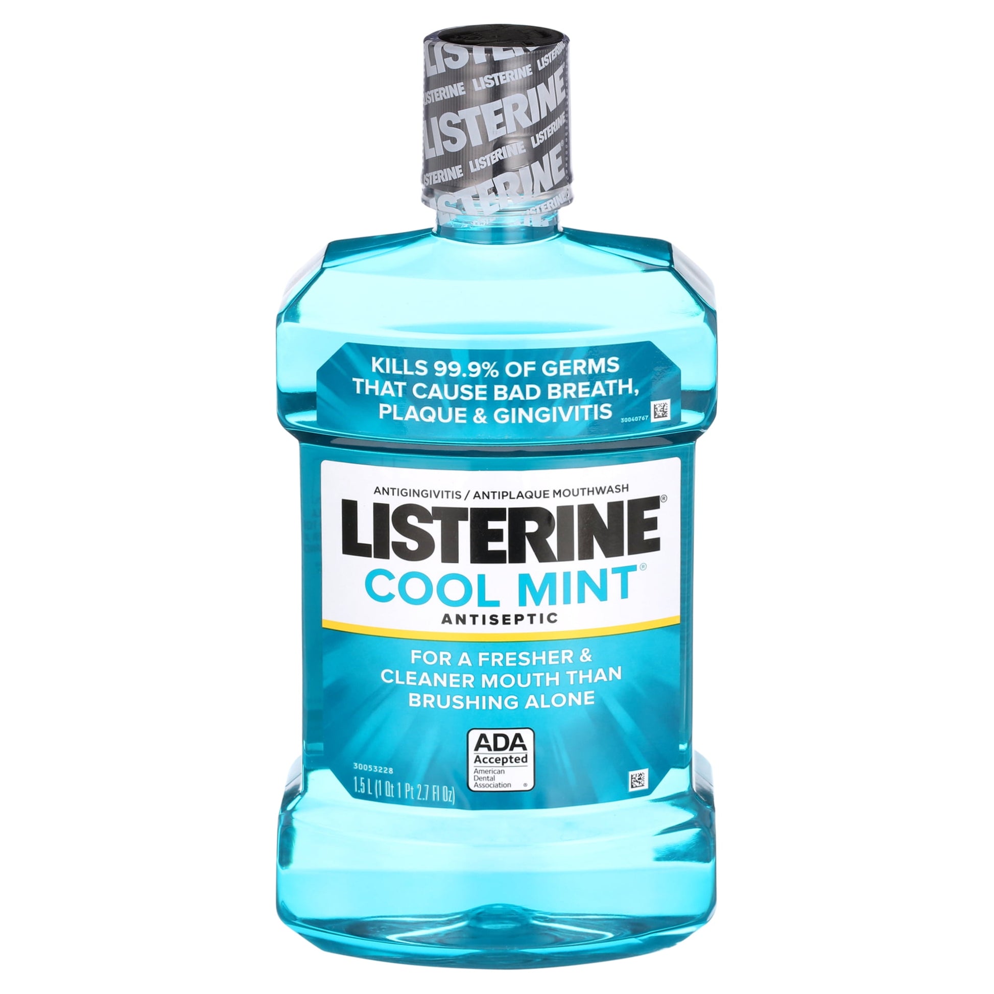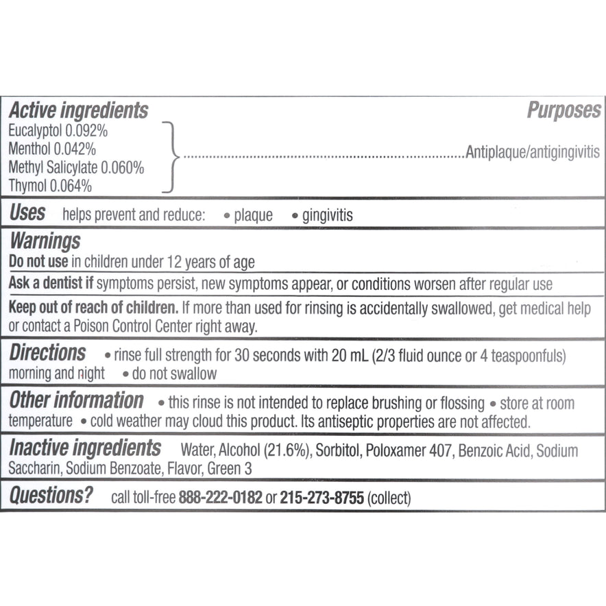 Protect your mouth from germs and get fresh breath with the Listerine Cool Mint Antiseptic Mouthwash. Accepted by the American Dental Association (ADA), this germ-killing mouthwash for bad breath is clinically shown to reduce plaque 52 percent more and reduce gingivitis 21 percent more than brushing and flossing alone. Adding a 30-second rinse of this refreshing mint flavored oral rinse to your morning and evening oral hygiene routines is all it takes to get 24-hour germ protection against those that cause bad breath, plaque, and gingivitis. From the #1 dentist recommended brand** of over the counter mouthwashes, Listerine Cool Mint Antiseptic Mouthwash contains the antiplaque and antigingivitis ingredients eucalyptol, menthol, methyl salicylate and thymol. *Germ kill provides sustained plaque reduction after a dental cleaning. Rinse is not intended to replace brushing or flossing. Use product only as directed. *when used twice daily **IQVIA survey May 2022-2026