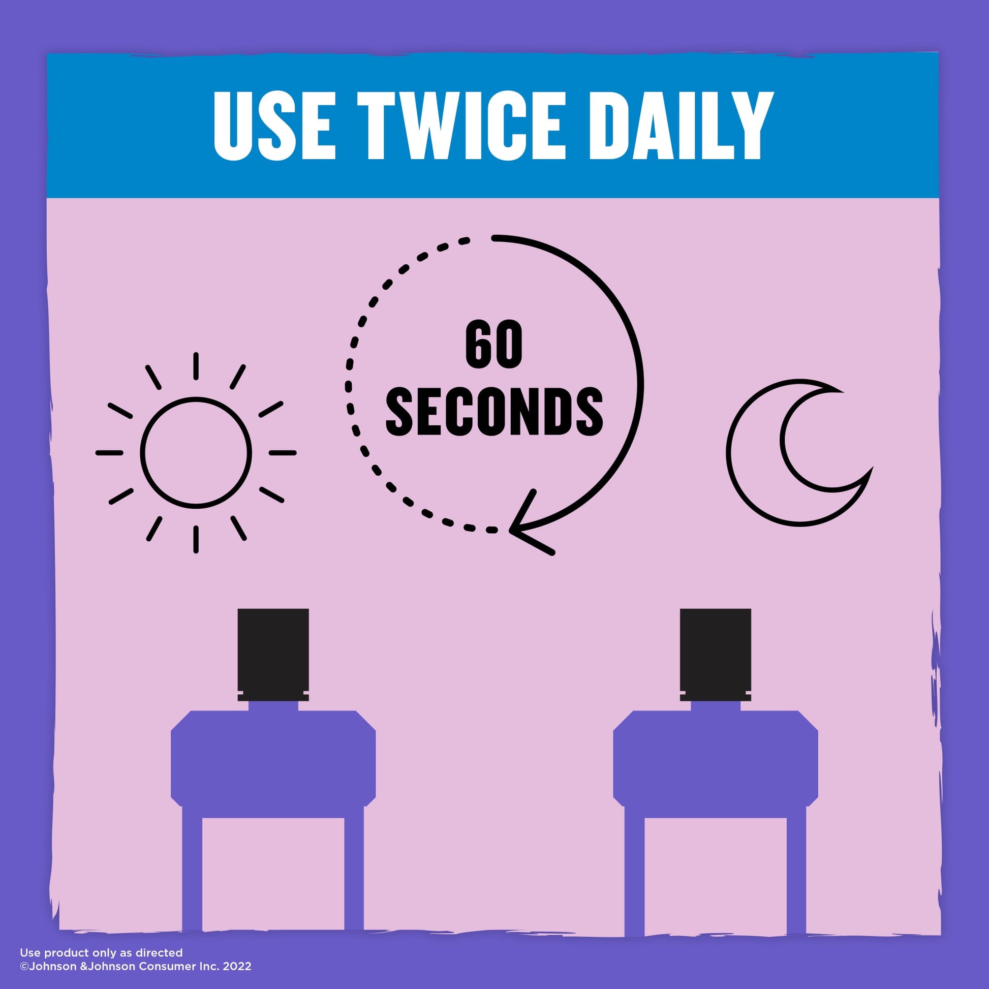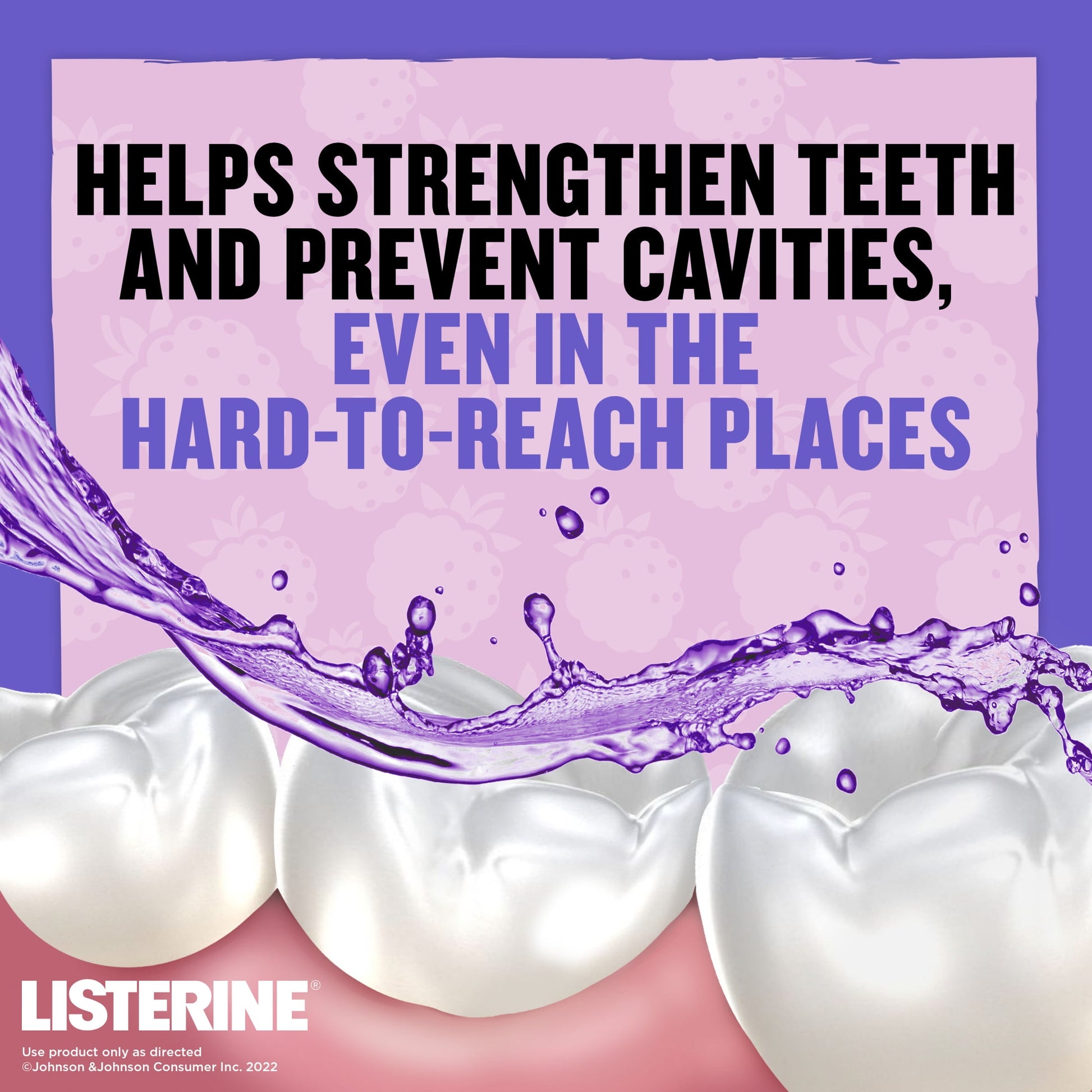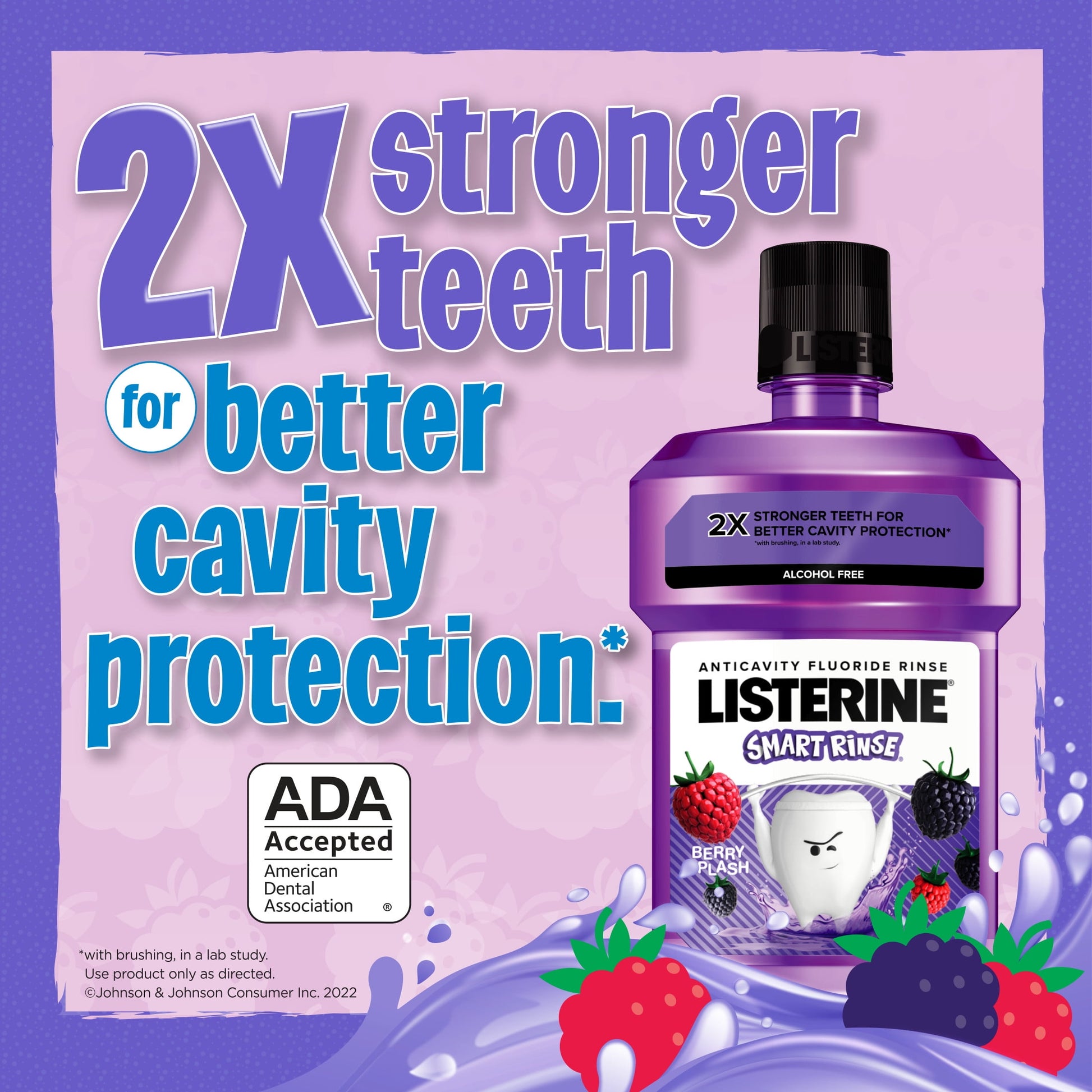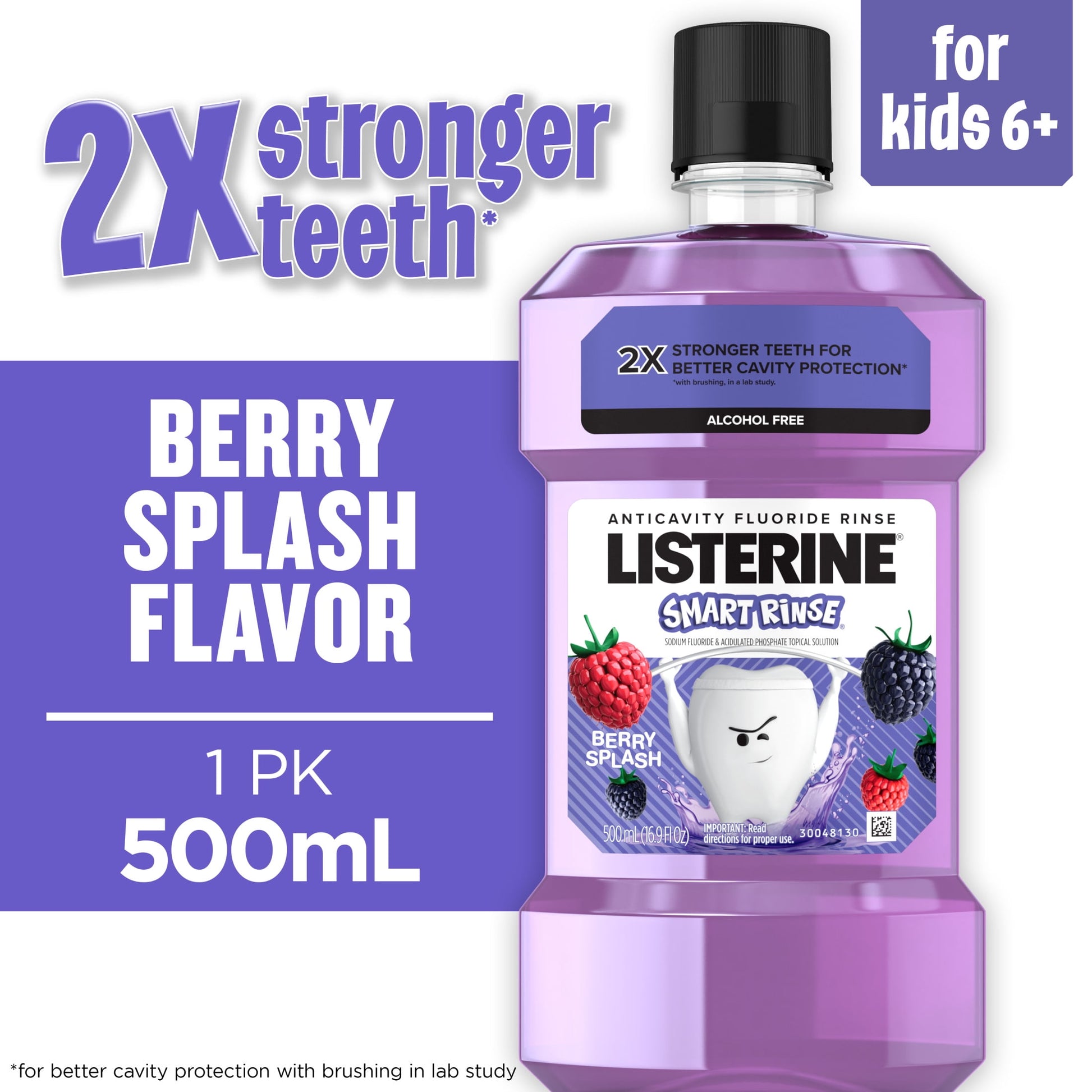 Help protect and strengthen your child's teeth with Listerine Smart Rinse Berry Splash Kids Anticavity Mouthwash. For children six years and older, this ADA-Accepted children's mouthwash provides oral care for kids by helping strengthen teeth, cleaning the mouth beyond brushing alone, and preventing dental cavities - even in hard-to-reach places. In a lab study, this alcohol-free mouthwash with sodium fluoride and acidulated phosphate offered two times stronger teeth for better cavity protection with brushing. The kids' oral rinse also freshens breath by killing 99% of bad breath germs and tints food particles and debris so kids can see immediate proof in the sink of a cleaner mouth. To encourage good daily oral hygiene habits, the anticavity mouthwash has a fun Berry Splash flavor designed for kids. To use, vigorously rinse with two teaspoons of the kids mouthwash for one minute, twice a day.