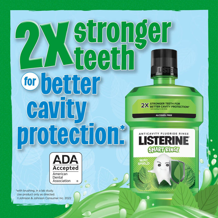Help protect and strengthen your child's teeth with Listerine Smart Rinse Mint Shield Kids Anticavity Mouthwash. For children six years and older, this ADA-Accepted children's mouthwash provides oral care for kids by helping strengthen teeth, cleaning the mouth beyond brushing alone, and preventing dental cavities - even in hard-to-reach places. In a lab study, this alcohol-free mouthwash with sodium fluoride and acidulated phosphate offered two times stronger teeth for better cavity protection with brushing. The kids' oral rinse also freshens breath by killing 99% of bad breath germs and tints food particles and debris so kids can see immediate proof in the sink of a cleaner mouth. To encourage good daily oral hygiene habits, the anticavity mouthwash has a fun Mint Shield flavor designed for kids. To use, vigorously rinse with two teaspoons of the kids mouthwash for one minute, twice a day.