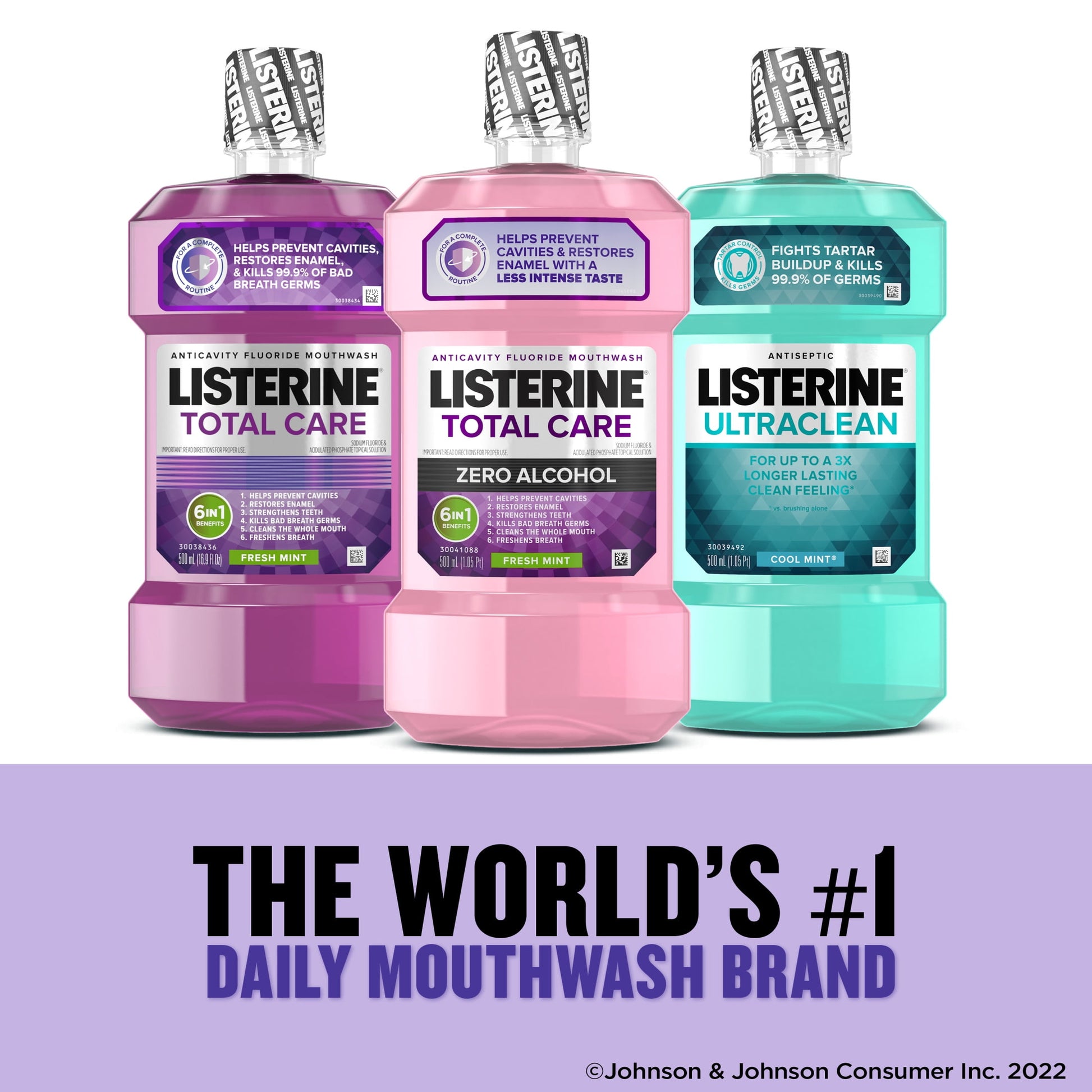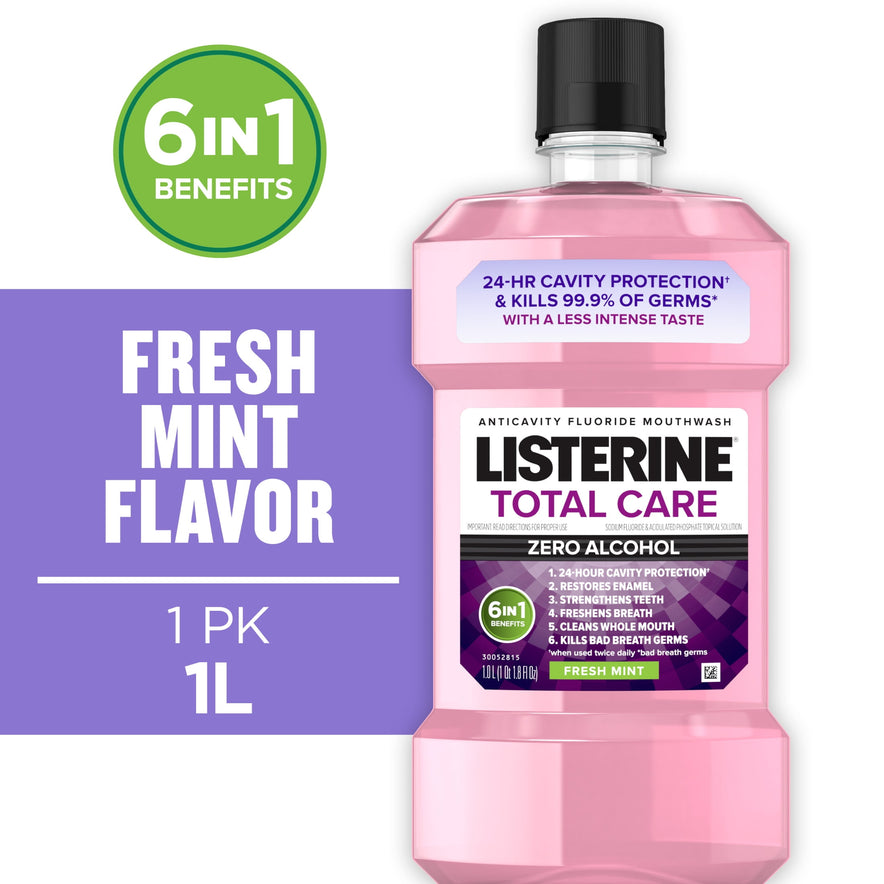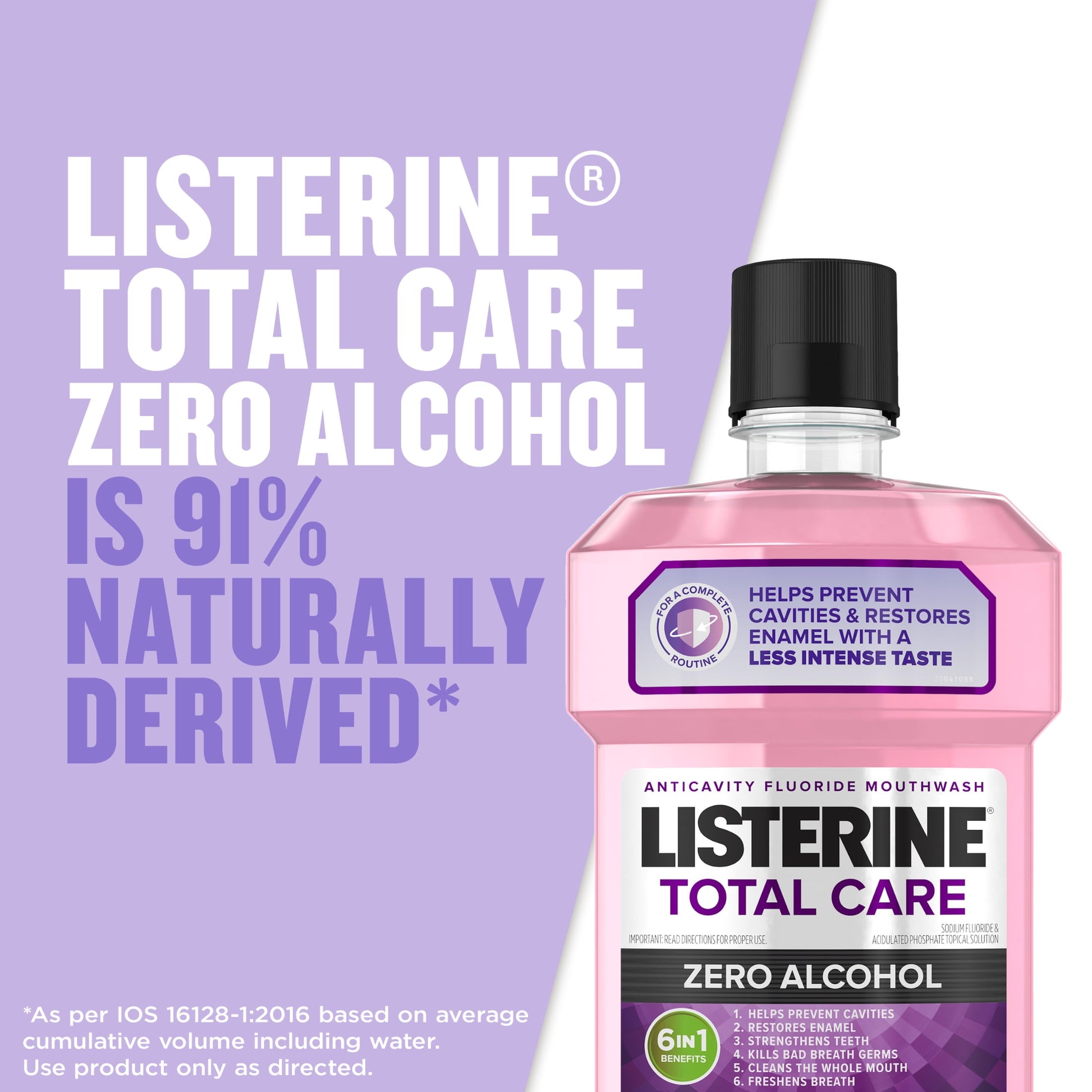 Give your mouth complete oral care with Listerine Total Care Zero Alcohol-Free Fluoride Anticavity mouthwash. Listerine Total Care Zero provides the same six dental hygiene benefits in one as Listerine Total Care Fluoride Anticavity Mouthwash, but in a less intense, alcohol-free mouthwash formula. With up to 2.4x the fluoride uptake than Act mouthwash brand**, this daily fluoride oral rinse formula helps prevent dental cavities by providing 50% greater strengthening of weakened enamel vs. brushing alone*. It freshens breath, kills 99% of germs that cause bad breath, cleans your whole mouth. From the #1 dentist-recommended brand of over the counter mouthwashes, this mouthwash for bad breath in Fresh Mint flavor gives your mouth a clean feeling you can taste, all with a zero alcohol formula. *In laboratory studies **In laboratory tests compared to Act Anticavity Fluoride Mouthwash, Act Total Care Anticavity Fluoride Mouthwash.