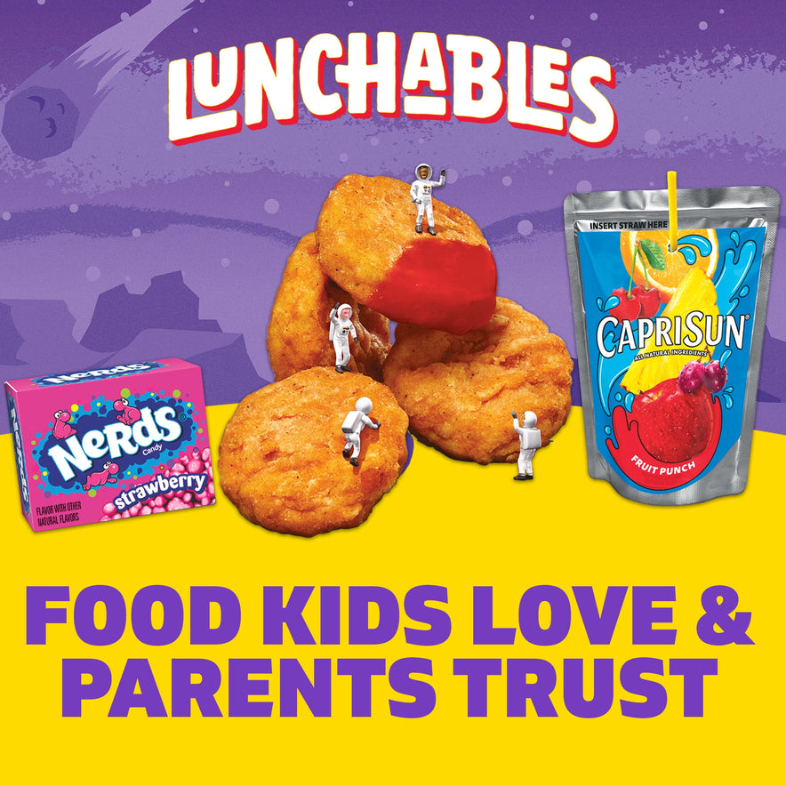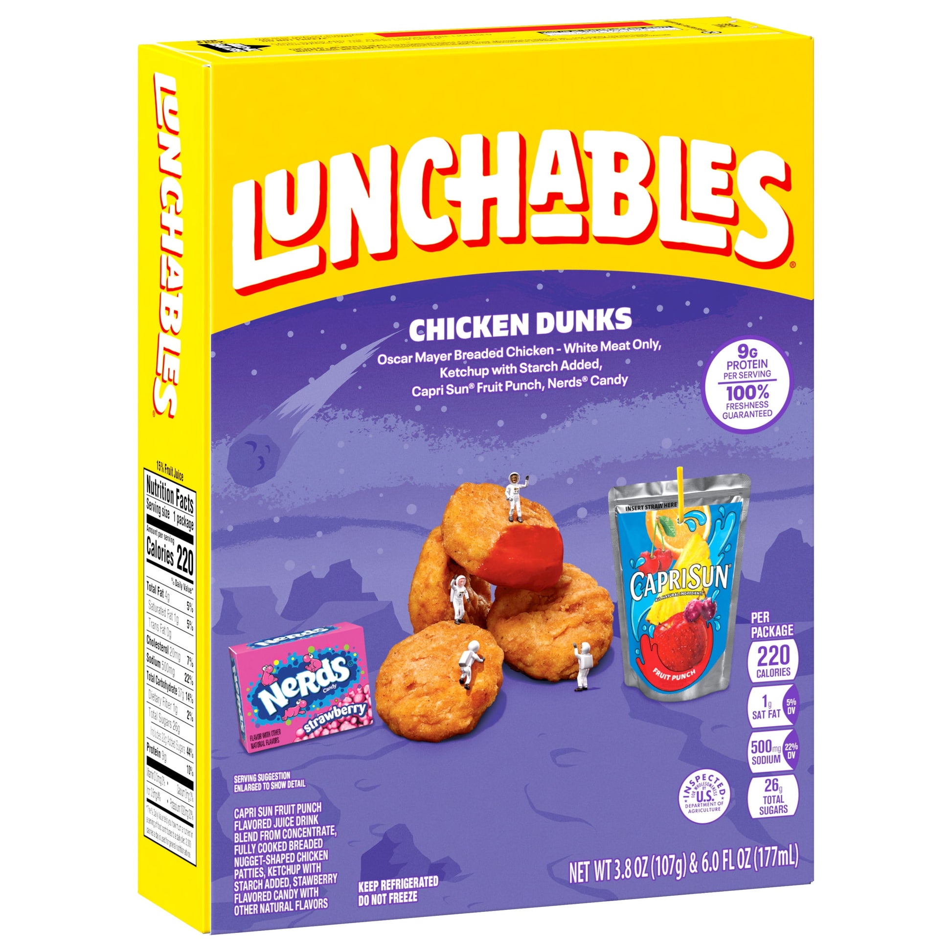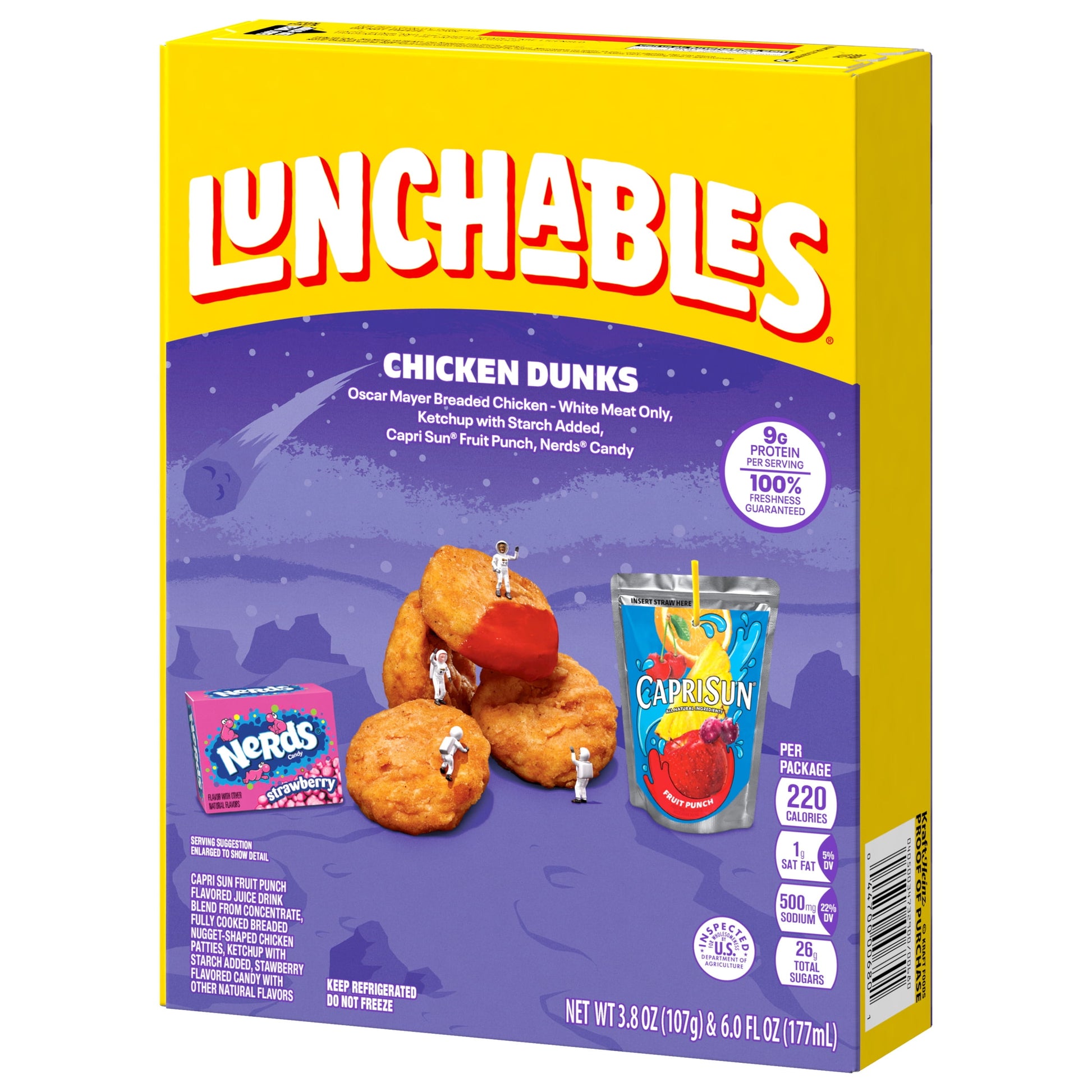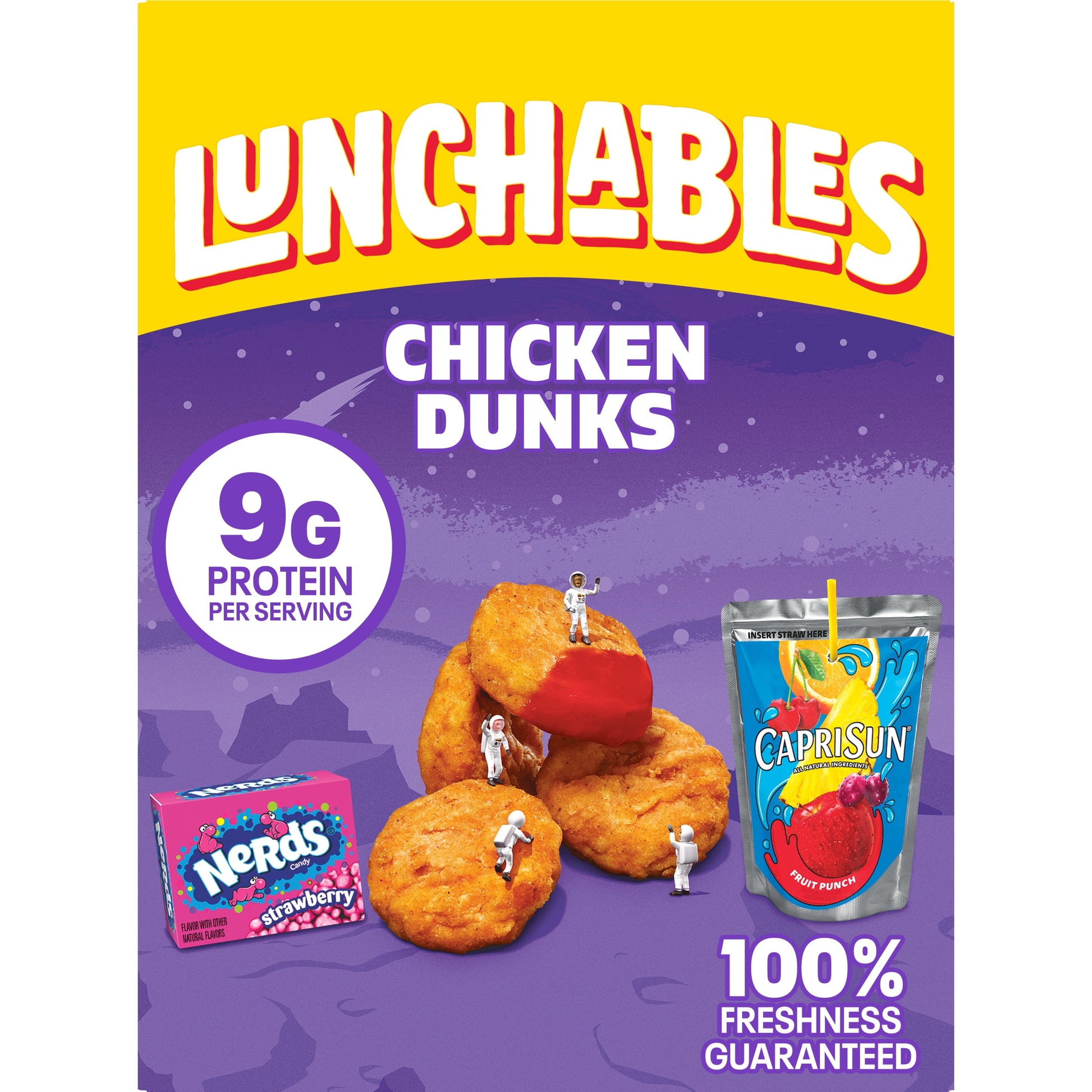 Built to be eaten, our Lunchables Chicken Dunks Meal Kit is the perfect option for a convenient meal kids will enjoy any time of day! Our chicken nugget lunch kit features real, epic food including Oscar Mayer breaded white meat chicken nuggets, ketchup dipping sauce, a juicy Capri Sun fruit punch drink and sweet Nerds candy for a dessert treat. Great for on the go, each ingredient comes in its own individual compartment in our serving tray, making it easy and fun to build your own unique combinations. Every 9.8 ounce box contains 9 grams of protein and 1 gram of fiber per serving. Always remember to keep your whole Lunchables refrigerated until you are ready to experience a delicious meal.