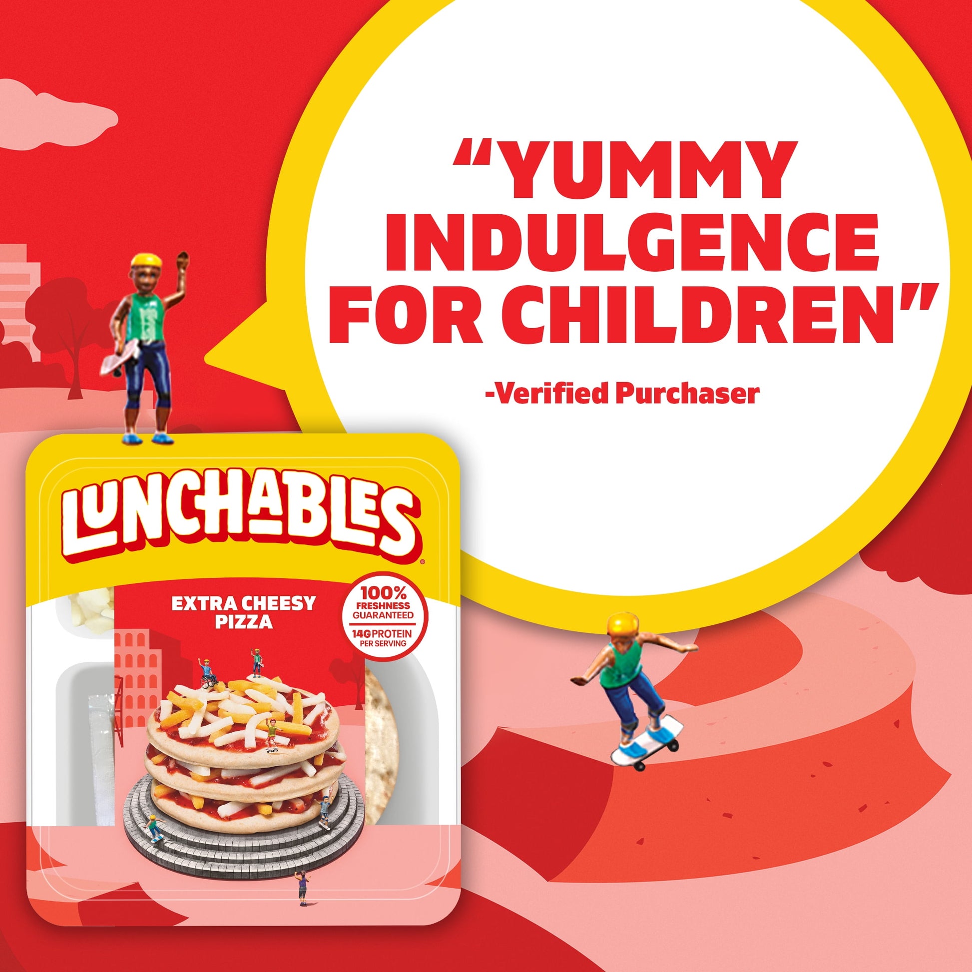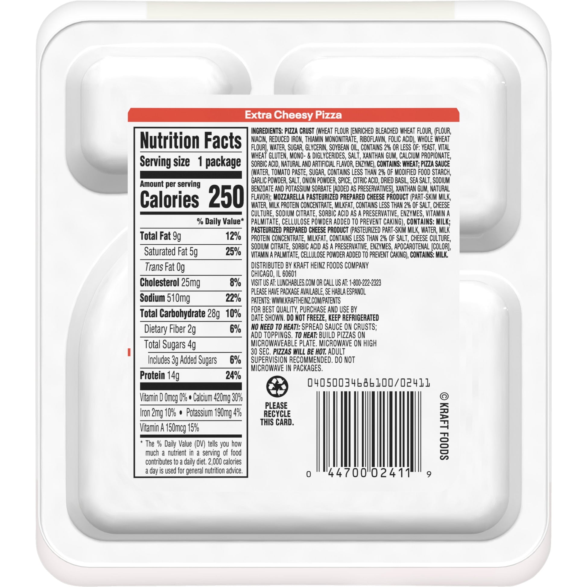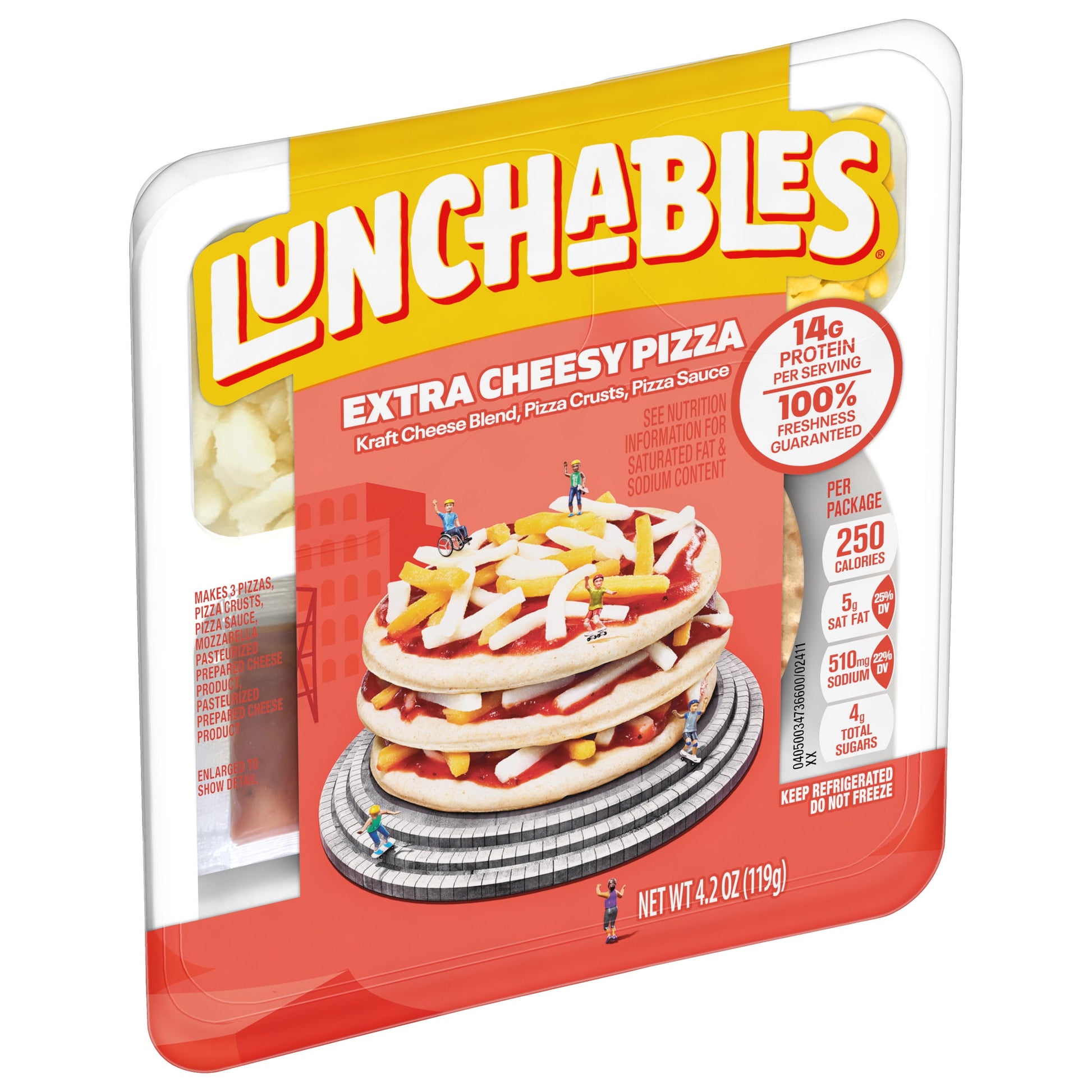 Built to be eaten, our Lunchables Extra Cheesy Pizza tray is the perfect option for a convenient snack kids will enjoy any time of day! Our pizza snack kit features real, epic food including pizza crusts, pizza sauce and Kraft cheese blend. Great for on the go, each ingredient comes in its own individual compartment in our serving tray, making it easy and fun to build your own unique combinations. Every 4.2 ounce plastic tray contains 14 grams of protein per serving. Always remember to keep your Lunchables pizza refrigerated until you are ready to experience a delicious snack.