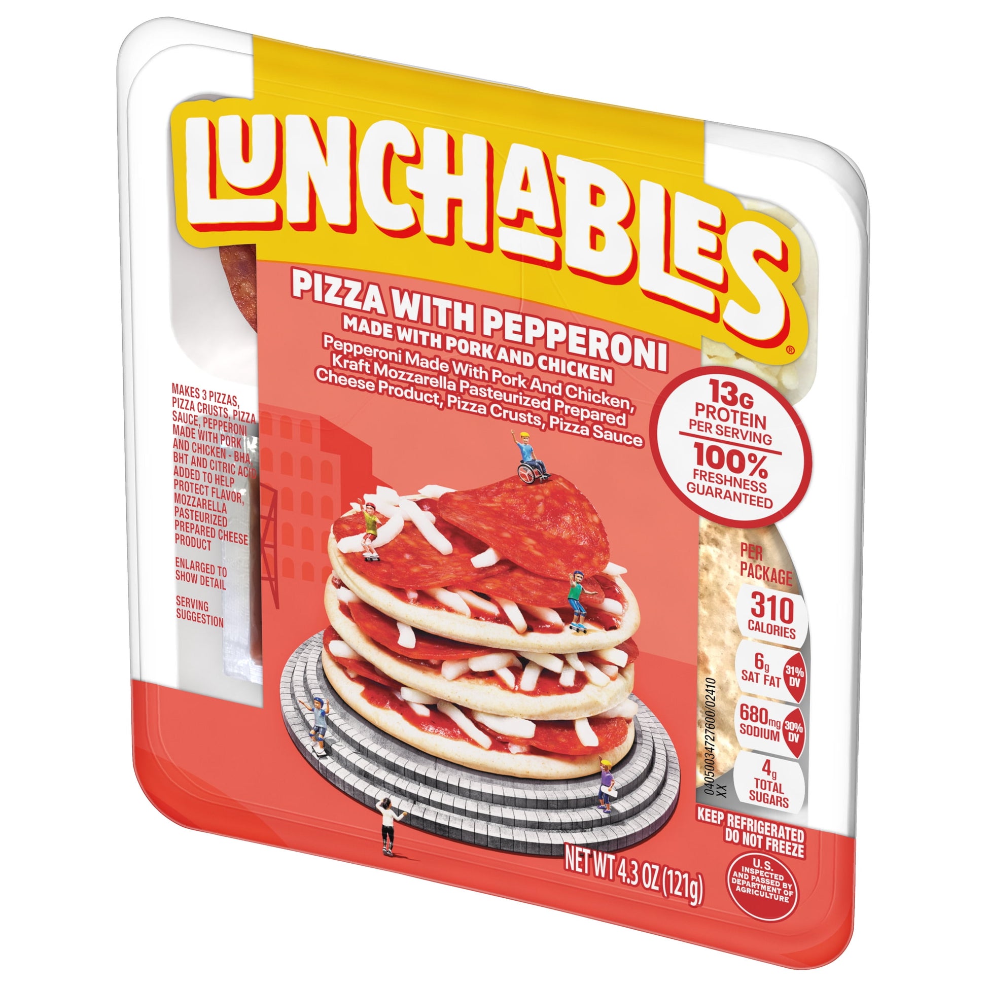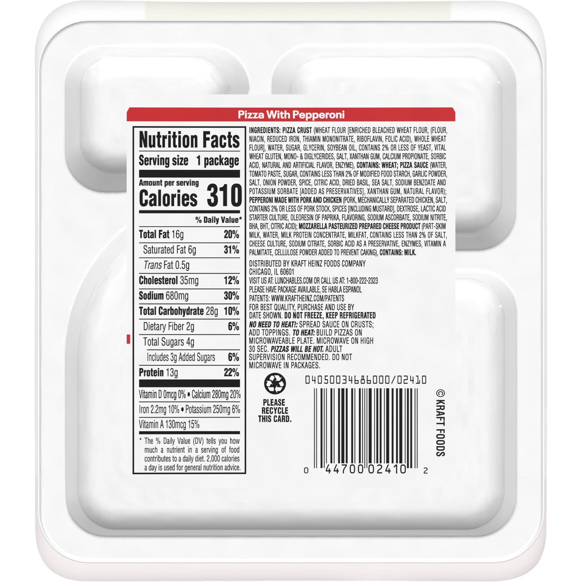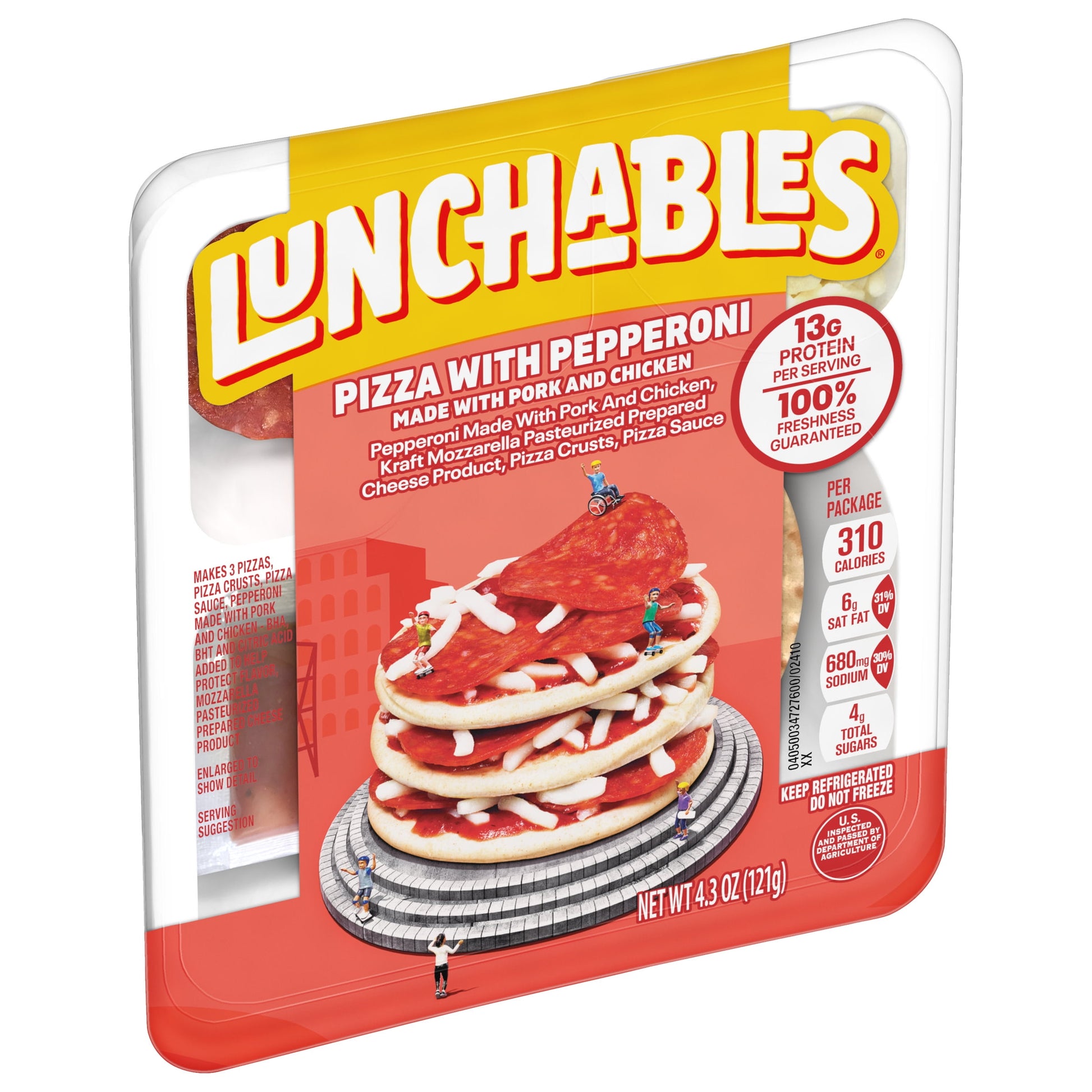 Built to be eaten, our Lunchables Pepperoni Pizza tray is the perfect option for a convenient snack kids will enjoy any time of day! Our pizza snack kit features real, epic food including pepperoni made with pork and chicken, pizza crusts, pizza sauce and Kraft mozzarella pasteurized prepared cheese product. Great for on the go, each ingredient comes in its own individual compartment in our serving tray, making it easy and fun to build your own unique combinations. Every 4.3 ounce plastic tray contains 310 calories per serving. Always remember to keep your Lunchables pizza refrigerated until you are ready to experience a delicious snack.