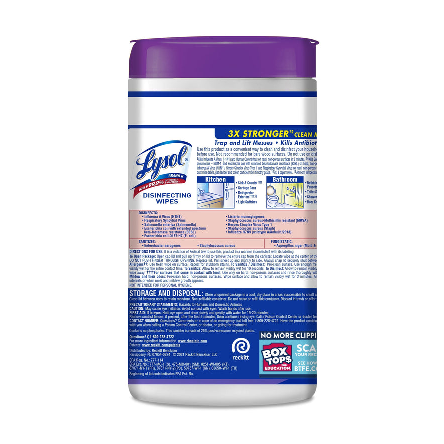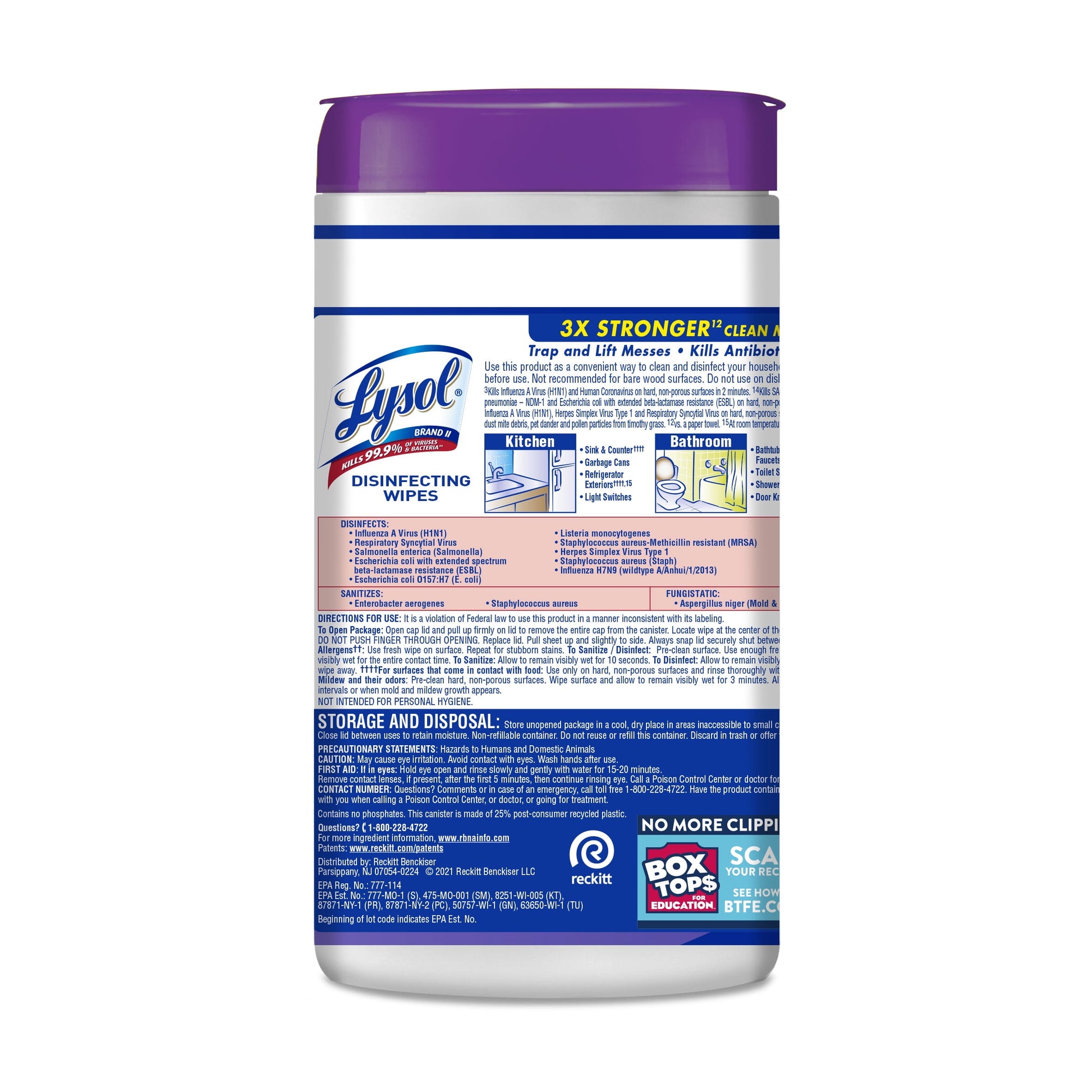 EPA #777-114. Lysol Disinfecting Wipes can be used as a convenient way to clean and disinfect your household surfaces. Lysol is stronger than the competition (vs. leading competitor – based on lab results). Each pre-moistened disposable wipe kills germs (on surfaces when used as directed) wherever you use it. No bottles, no sponges, no mess. Kills Salmonella Enterica (Salmonella), Influenza A Virus (H1N1), Herpes Simplex Virus Type 1 and Respiratory Syncytial Virus on hard, non-porous surfaces in 4 minutes. Disinfects including: Escherichia coli, Staphylococcus aureus (Staph), Influenza H7N9 and Streptococcus Pyogenes (Strep) among others. Kills 99.9% of Viruses and Bacteria when used as directed. Removes allergens (Pet Dander, Dust Mite Debris and Pollen Particles). Effective disinfecting has never been easier. Lysol Disinfecting Wipes are also safe to use on your gadgets like Smartphones, Tablets & Remote Controls.