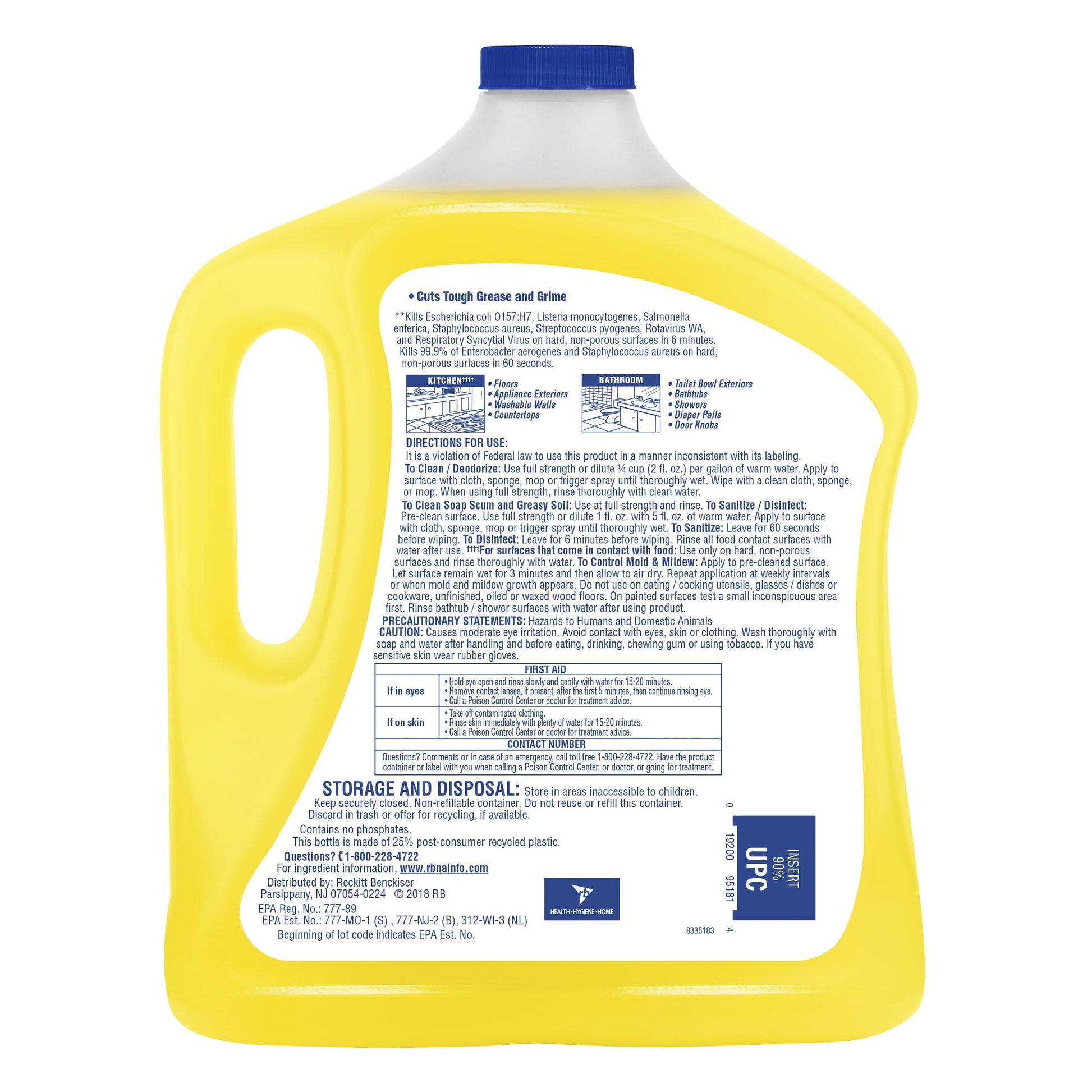 Help stop the spread of germs from top to bottom of your home with Lysol Multi-Purpose Cleaner. The Lysol Clean & Fresh Multi-Surface Cleaner kills 99.9% of viruses and bacteria, and is approved to kill germs even when diluted (when used as directed). Dilute in water for use on large surfaces like floors and watch it cut through tough grease and grime. Can be used on hard, non-porous surfaces in the kitchen, bathroom and other areas of the home. Do not use on eating/cooking utensils; glasses, dishes, or cookware; unfinished, oiled, or waxed floors. On painted surfaces, test a small, inconspicuous area first. Rinse bathtub/shower with water after using product.