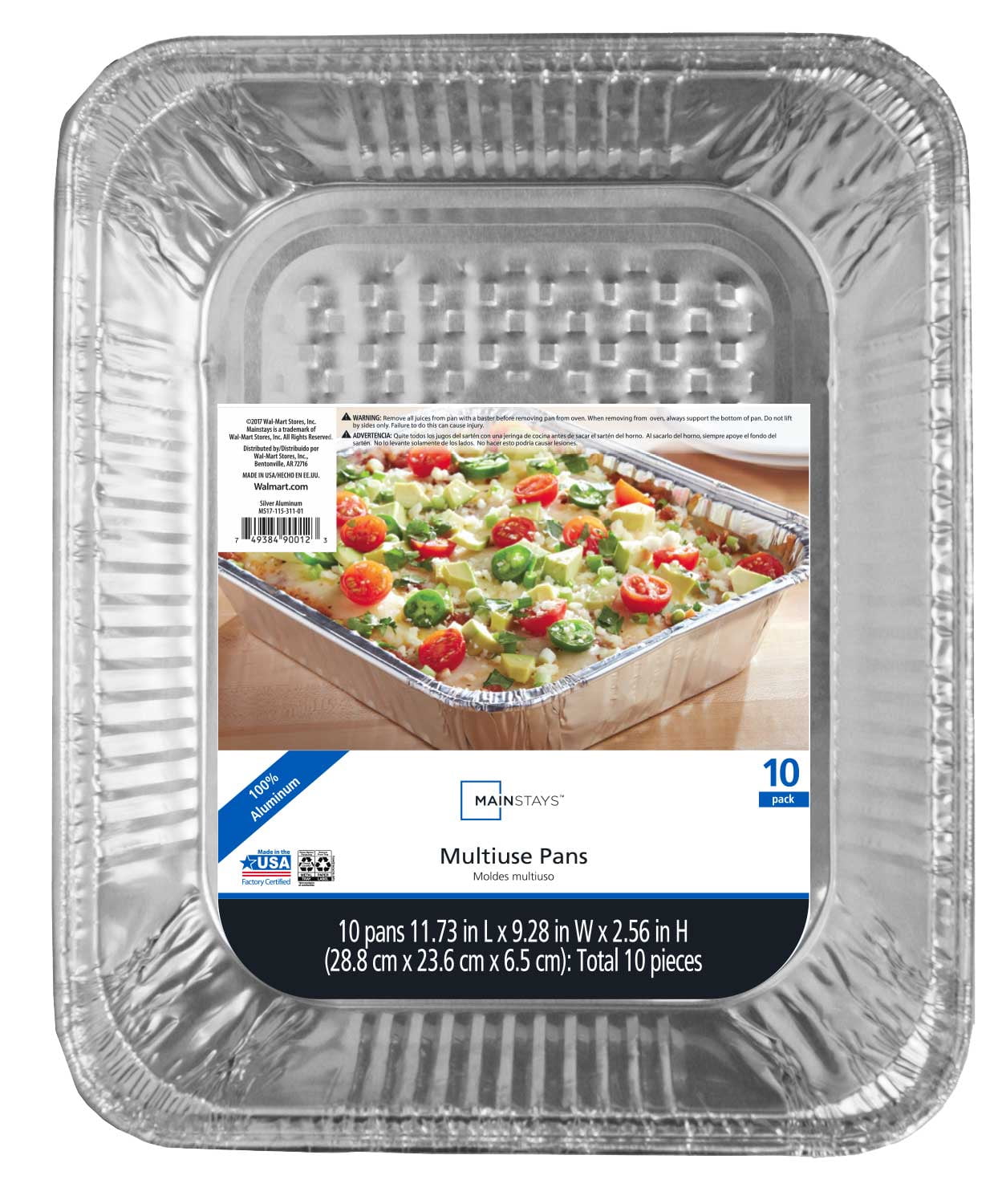 Add convenience and performance to your kitchen pantry with the multi-use Mainstays Half Steam Table Pan. Item number 90012. Each package includes ten multi-use pans. It is made of aluminum for quick and even heating, for great results every time. The pan dimensions are 11.73-inches long x 9.28-inches wide x 2.56-inches deep. The convenient 10 pack will supply you with enough pans for your next buffet. Not only can you use these pans for steam tables, but they are ideal for lasagna, mostaccioli, pasta salad, casseroles, macaroni and cheese, or even larger quantities of vegetables, potatoes, salads and other side dishes. The wide rims allow for easy handling. Remember to support the bottom of the pan when there is food or water in it to prevent accidents. Use it for Sunday dinner or make your favorite dish and take it to the next party. Don't worry about getting your pan back, it is disposable. Clean-up is easy and eco-friendly, just rinse and recycle. Kosher certified by the Orthodox Union.