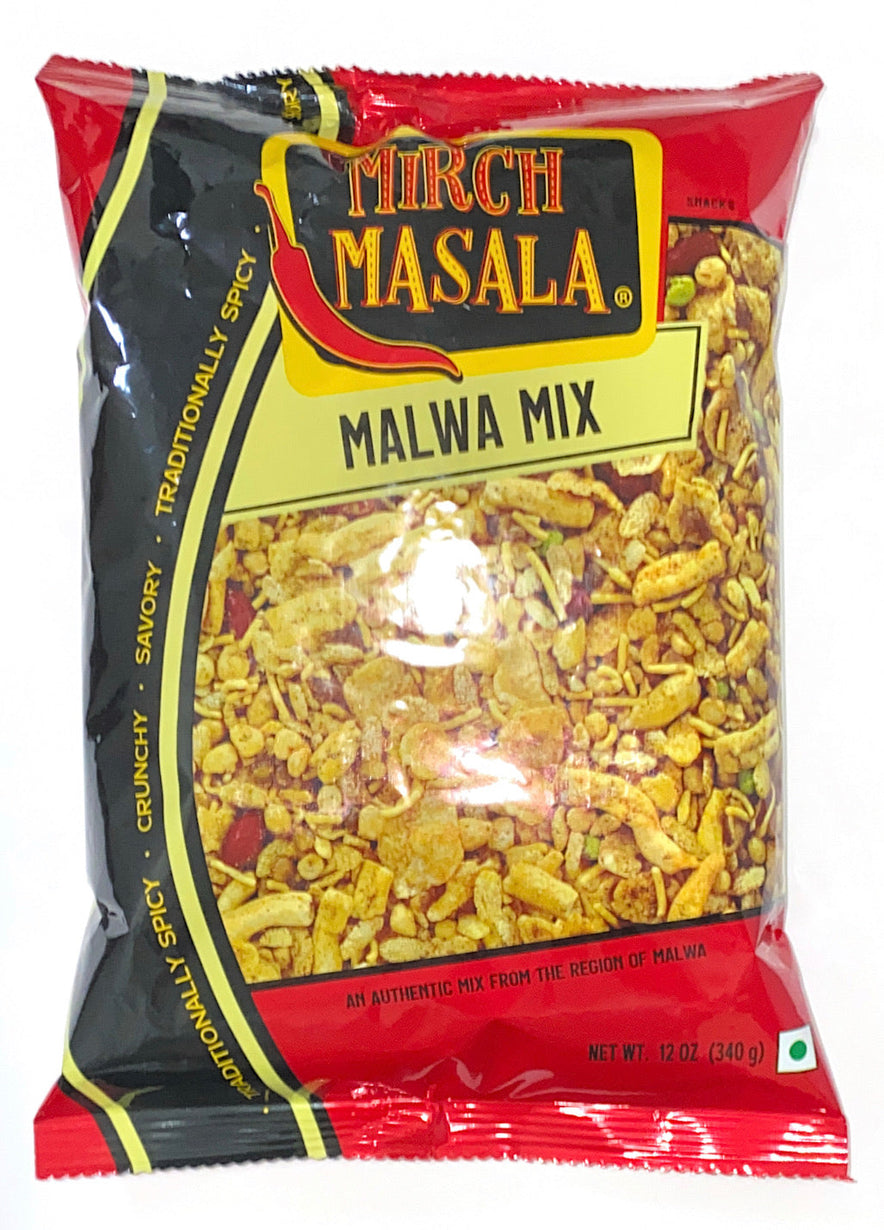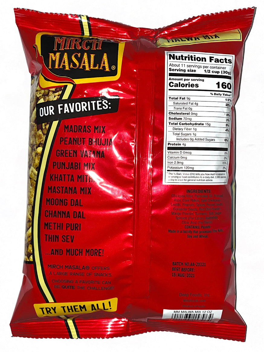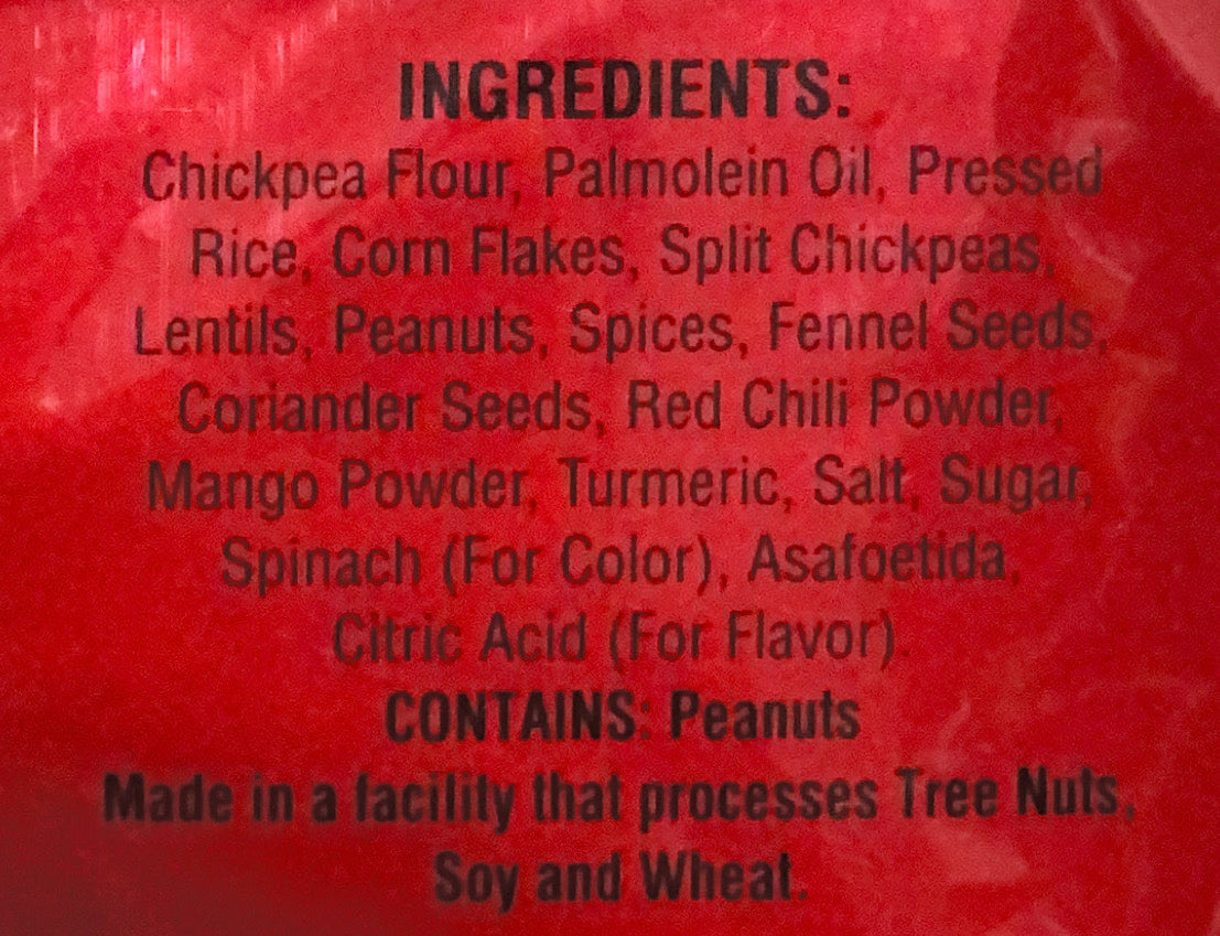 An authentic mix from the region of Malwa in India. Ingredients: Gram flour, pressed rice, corn flakes, peanut, split gram, lentils, palmolein oil, salt, coriander, spinach (for color) and spices.