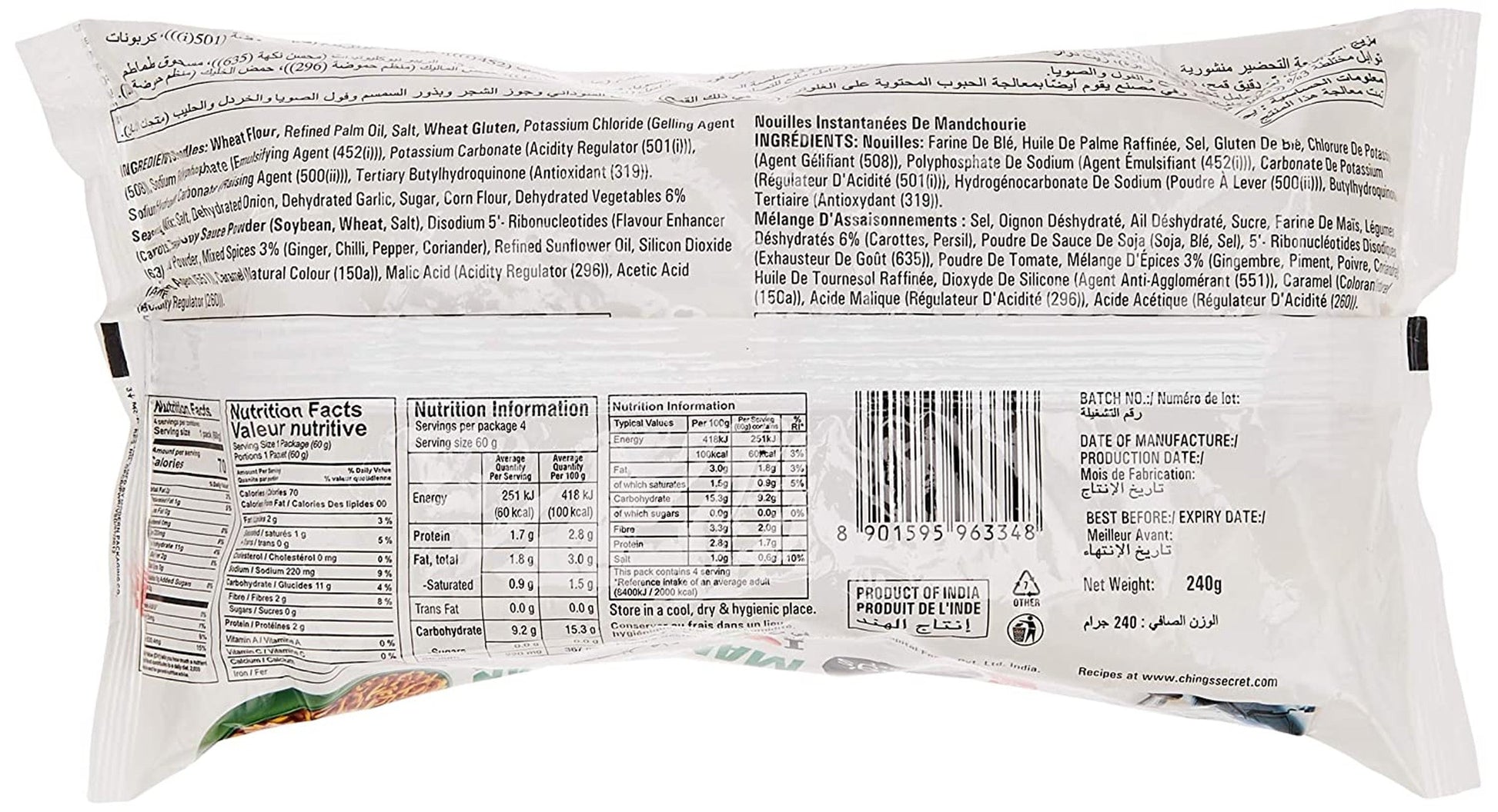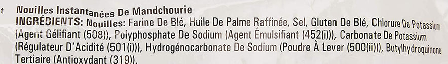 Noodles: Wheat Flour, Palmolein Oil, Sodium & Pottassium Salts, Wheat Gluten, Guar Gum. Seasoning Mix: Spice Mix (Garlic, Ginger, Onion, Coriander, Cumin, Green Chilli, Capsicum), Noodles Powder (Wheat Flour, Palmolein oil, Sodium & Potassium Salts, Wheat Gluten, Guar Gum), Salt, Sugar, Flavor Enhancers ( E 627, E 631, E 640), Yeast Extract, Hydrolysed vegetable Protien, Corn Flour, Anticaking Agent (E 551), Soy Sauce Powder, Sunflower Oil, Acidity Regulator (E 262 (ii)), Tapioca Starch, Natural Color - Caramel (E 150d).