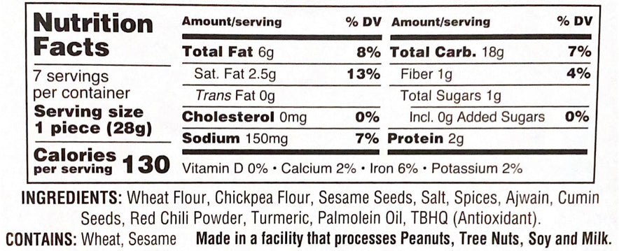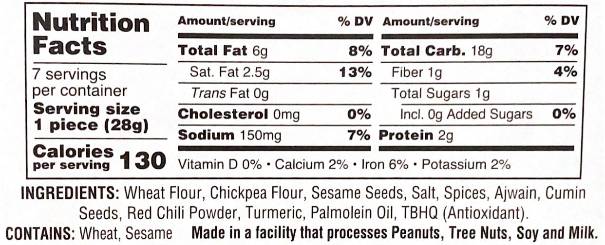 Thin, crunchy, roasted crisps commonly eaten during breakfast. They are made with wheat flour, oil and salt. This variety is flavored with a variety of spices