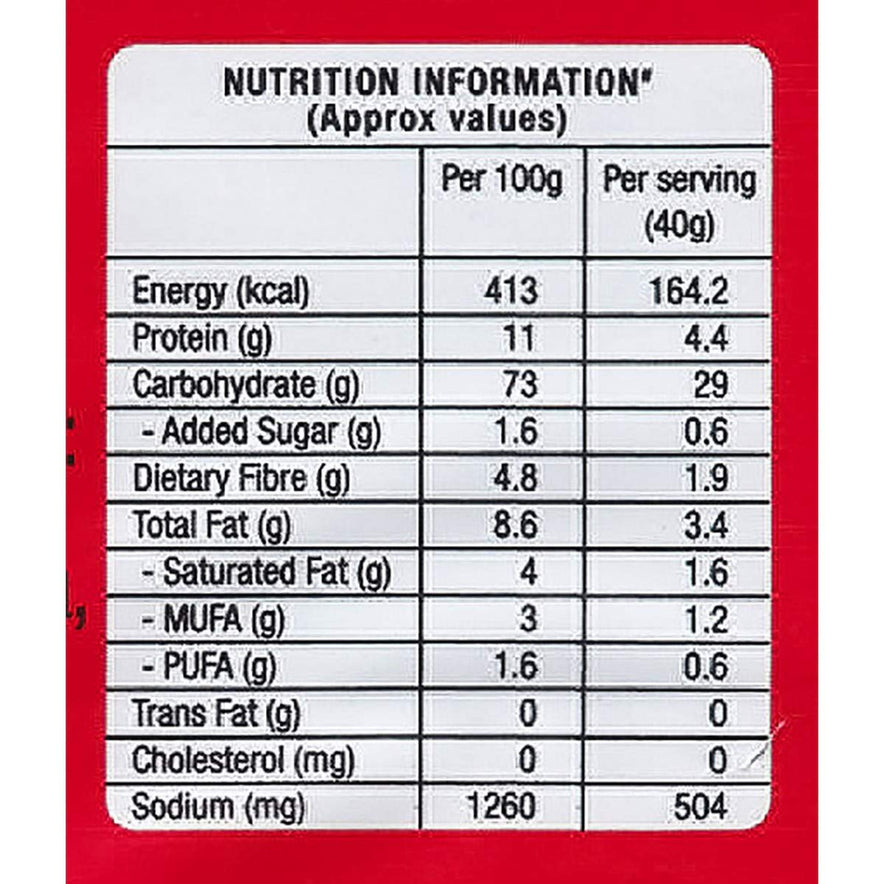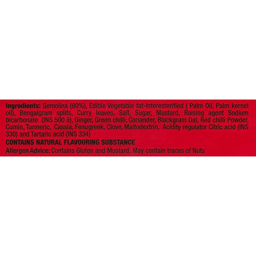 Semolina, Edible vegetable fat, Bengal gram dal, Salt, Curry leaves, Sugar, Mustard, Lemon Powder, Sodium bicarbonate, Green chilli, Ginger, Coriander, Turmeric, Black gram dal, Red chilli, Cumin, Cinnamon, Fenugreek, Clove, Citric acid.