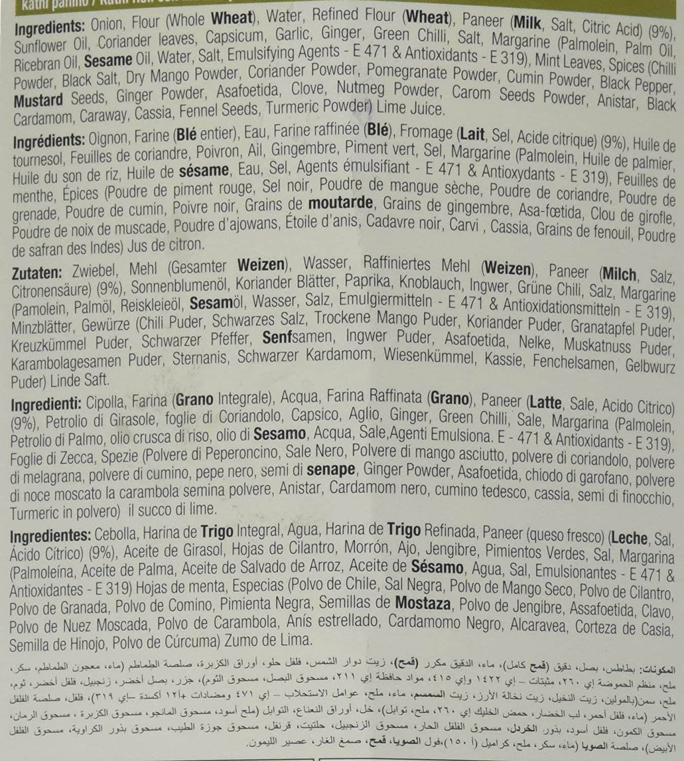 Ingredients: onion, paneer, refined wheat flour, water, milk, sunflower oil, green capsicum, coriander leaves, garlic, green chilli, ginger, salt, margarine, mint leaves, red chilli powder, lemon juice, spices, dry mango powder, turmeric powder, coriander powder, cumin powder, black salt.