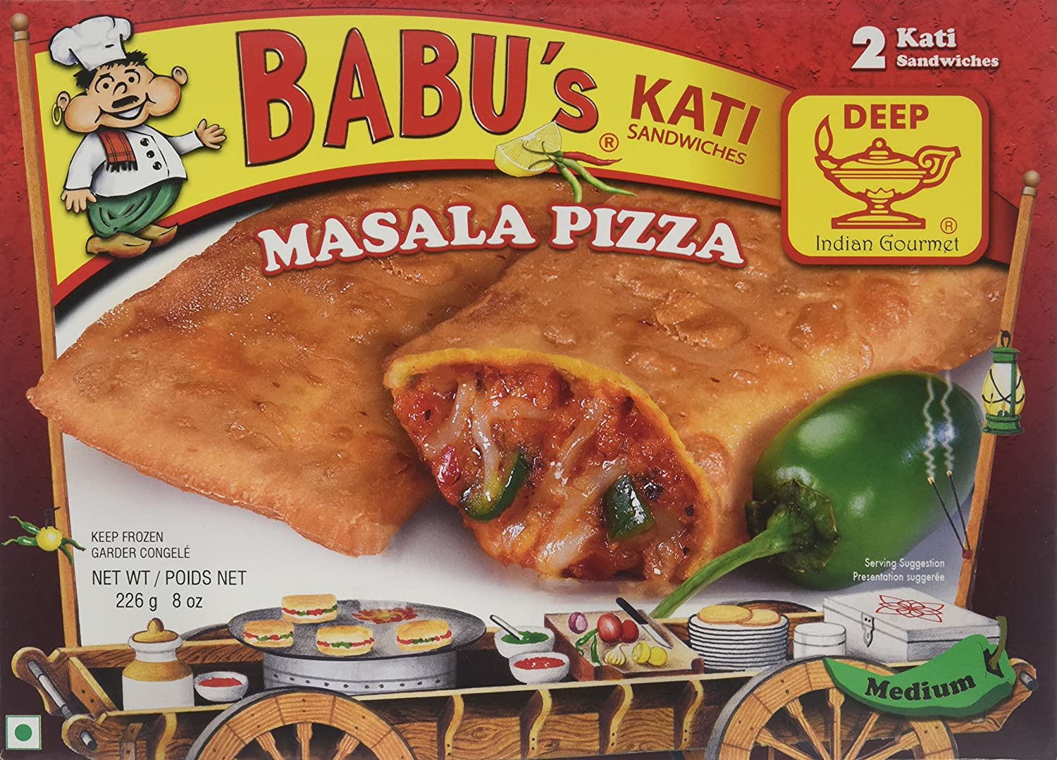 Deep Babu's Kati Pockets Masala Pizza | Kathi Roll is a new take on traditional pizza. Sandwiches Masala Pizza includes two pieces. The outer layer was thick enough to keep the pizza filling intact even after heating. The filling had a slightly doughy texture.