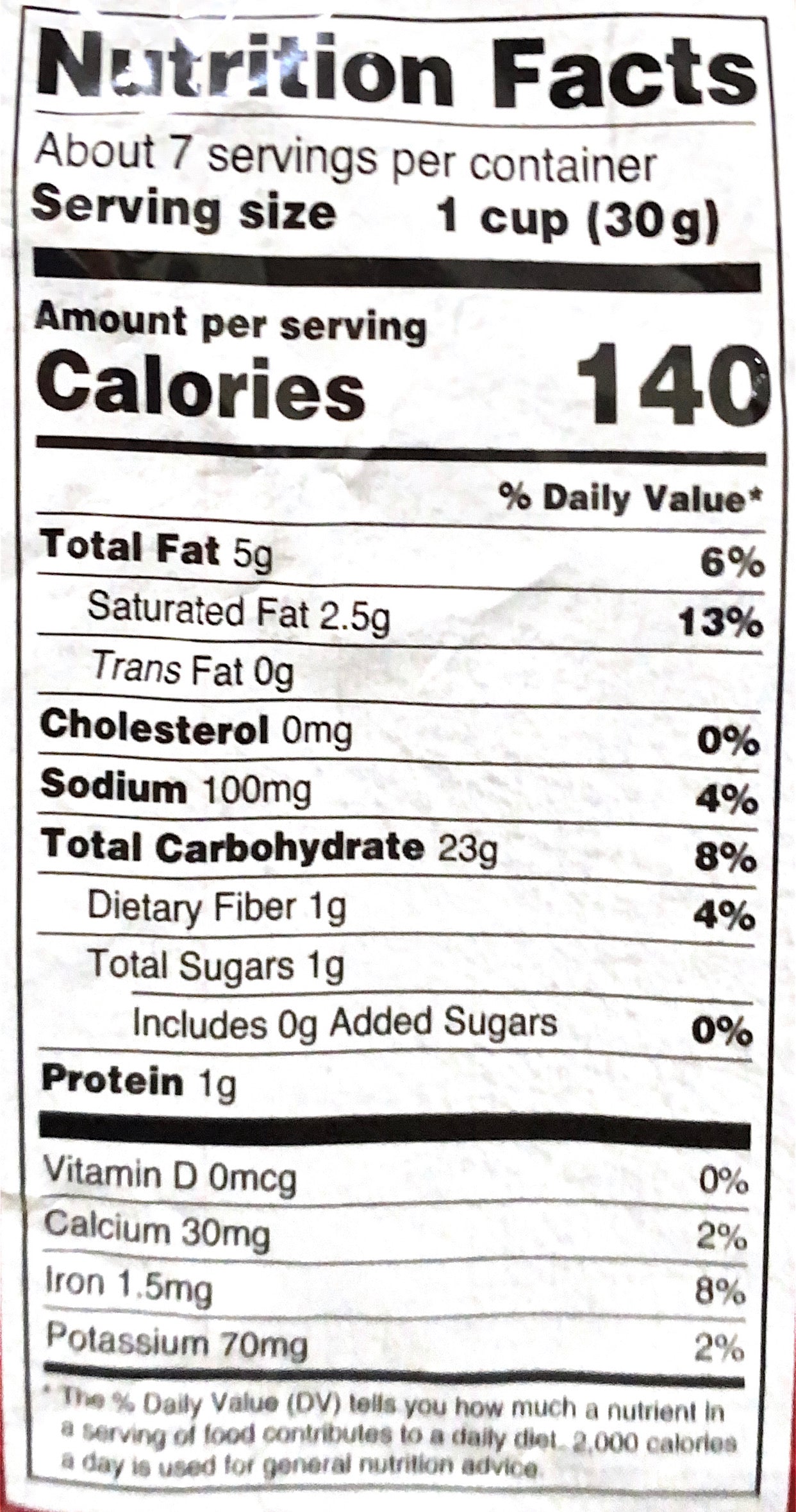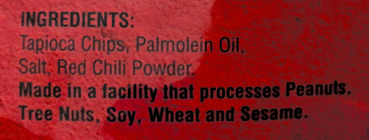 Crunchy, salty and spicy chips made from white tapioca. Ingredients: tapioca chips, palmolein oil, salt, spices.