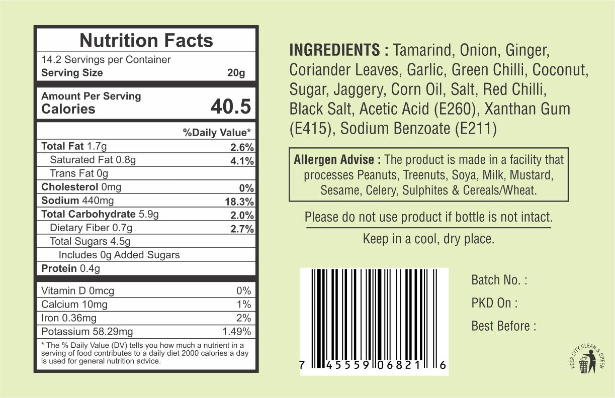 Sweet and spicy chutney with Tamarind, onion, ginger, coriander, garlic, green pepper, coconut and other spices.