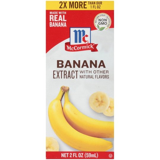 Infuse real, fruity banana taste into everything from homemade muffins to cakes and cookies. McCormick® Banana Extract is made with real banana, without any artificial flavors, artificial colors or corn syrup. It’s also non-GMO and gluten-free. Here at McCormick we’re always working to craft the best flavors for you and your family. That’s why you won’t find any artificial flavors or coloring in this extract. Because there are no artificial colors, Banana Extract will not add color to your recipes. Tip: Try using a dash of food coloring to achieve desired hues. This McCormick® Banana Extract is in a Plastic box that is 2 fluid ounces. Store this shelf-stable item at an ambient temperature.
