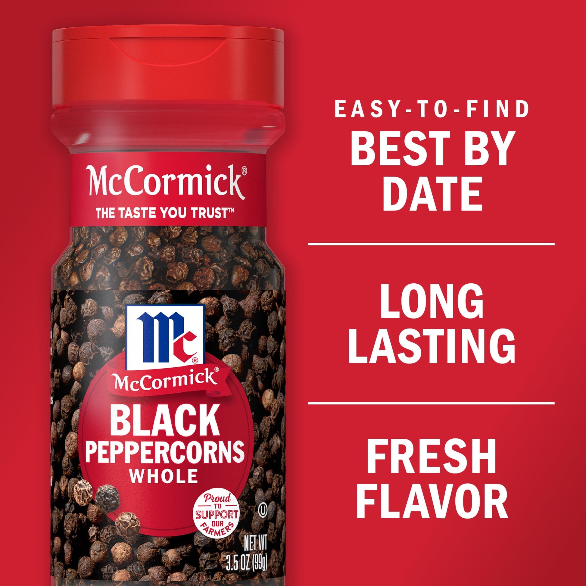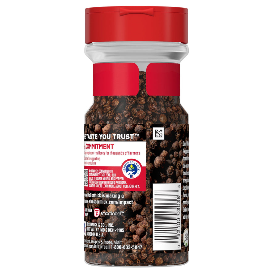 At McCormick, we hand-harvest our black peppercorns to ensure that the larger berries are picked for the boldest flavor. For freshly ground pepper, fill your grinder with our peppercorns. Once a rare spice, today black peppercorns grace kitchens and tables around the world. A twist of the grinder adds an earthy, pungent kick to whatever’s on your plate. Black pepper enhances the flavor of meat, gives a spicy bite to soups and stews and brings layers of flavor to vegetables. When added whole, peppercorns bring gentle heat. Use them in herb sachets to flavor long-simmered stocks and stews. Add them to brines for whole chickens, turkeys and pork roasts. Or, include peppercorns in spice mixes for pickling. McCormick is proud to invest in our farmers: 1. Supporting higher incomes and resiliency for thousands of farmers and 2. Committed to supporting Women in Agriculture. This McCormick® Whole Black Pepper is in a Plastic bottle that is 3.5 ounces. Store this shelf-stable item at an ambient temperature.