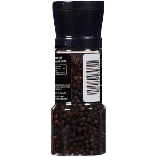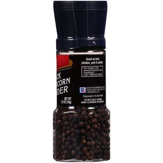 With the McCormick Black Peppercorn Grinder, you can enjoy freshly ground pepper whenever you need it. Make any dish a little bolder with this kitchen essential. Simply twist the built-in grinder to add the desired amount of flavor. Choose fine, medium or coarse grind.This freshly ground pepper delivers extra flavor and aroma to tossed salads or steamed veggies. Or sprinkle this essential spice on roasted meats and use it in marinades to develop deep, zesty flavor. In fact, you can use black pepper on almost any dish to delight pepper lovers everywhere. This McCormick® Black Peppercorn Grinder is in a Plastic bottle that is 2.5 ounces. Store this shelf-stable item at an ambient temperature.