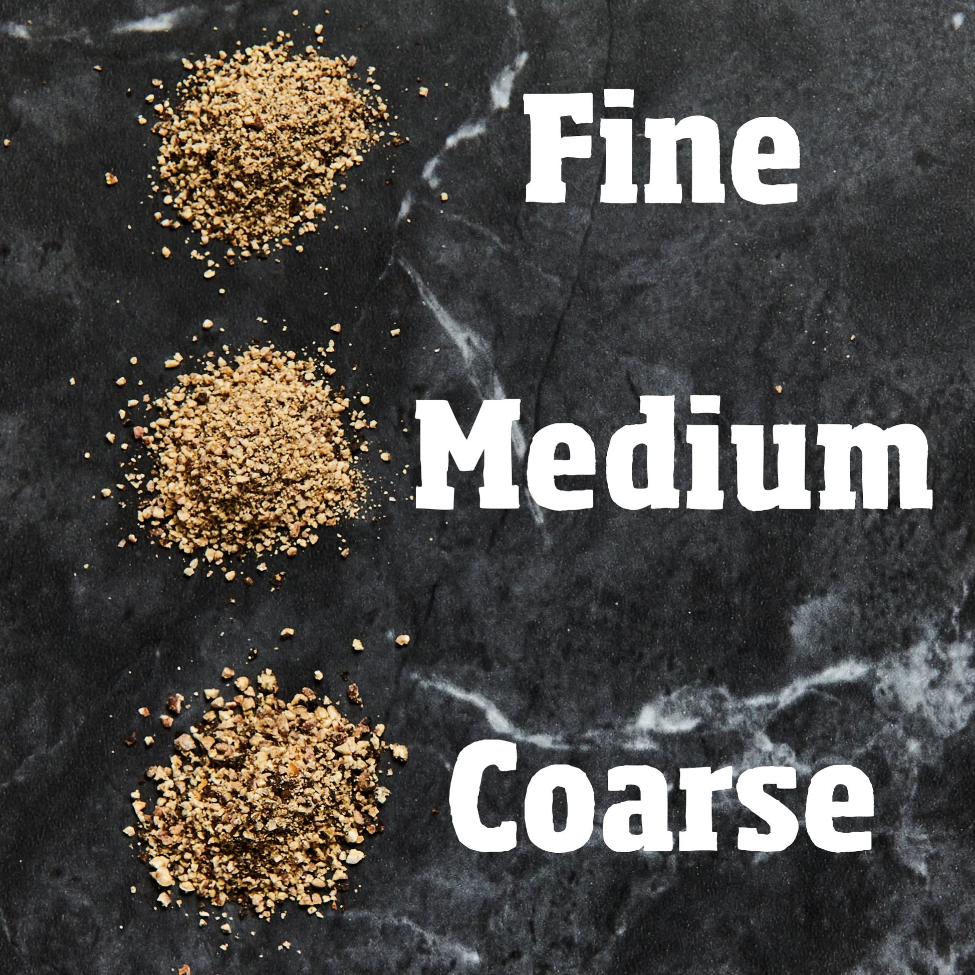 Adjustable grinder conveniently offers coarse, medium or fine grind; not refillable