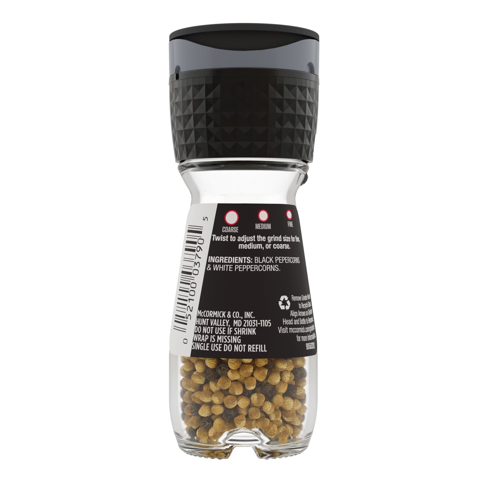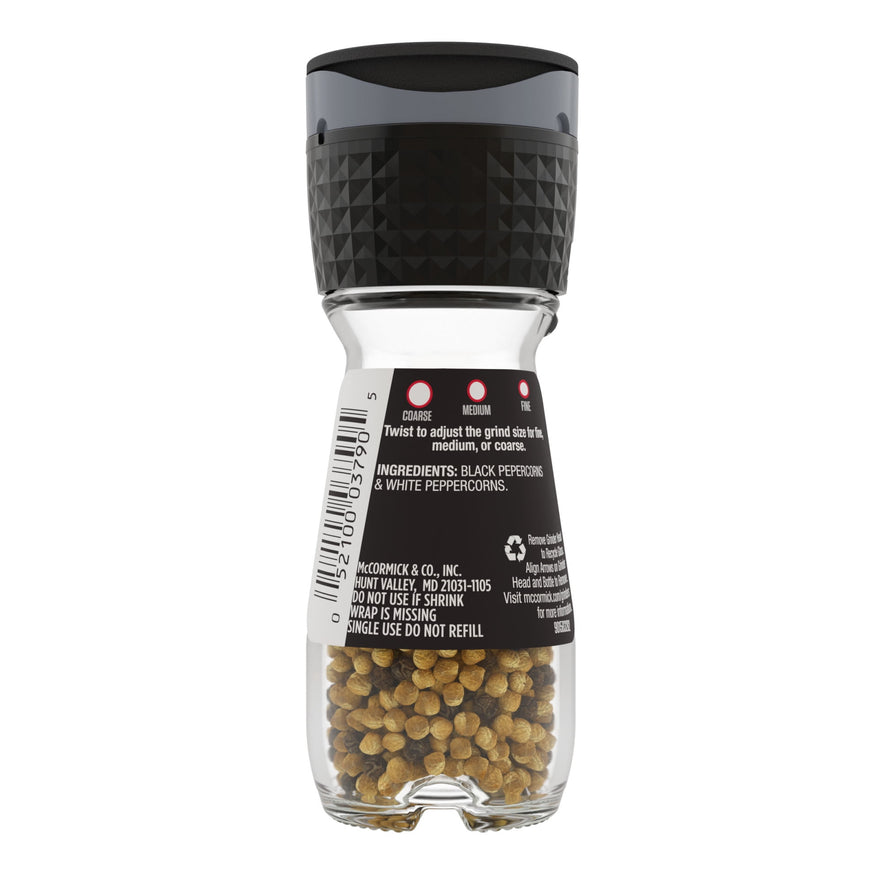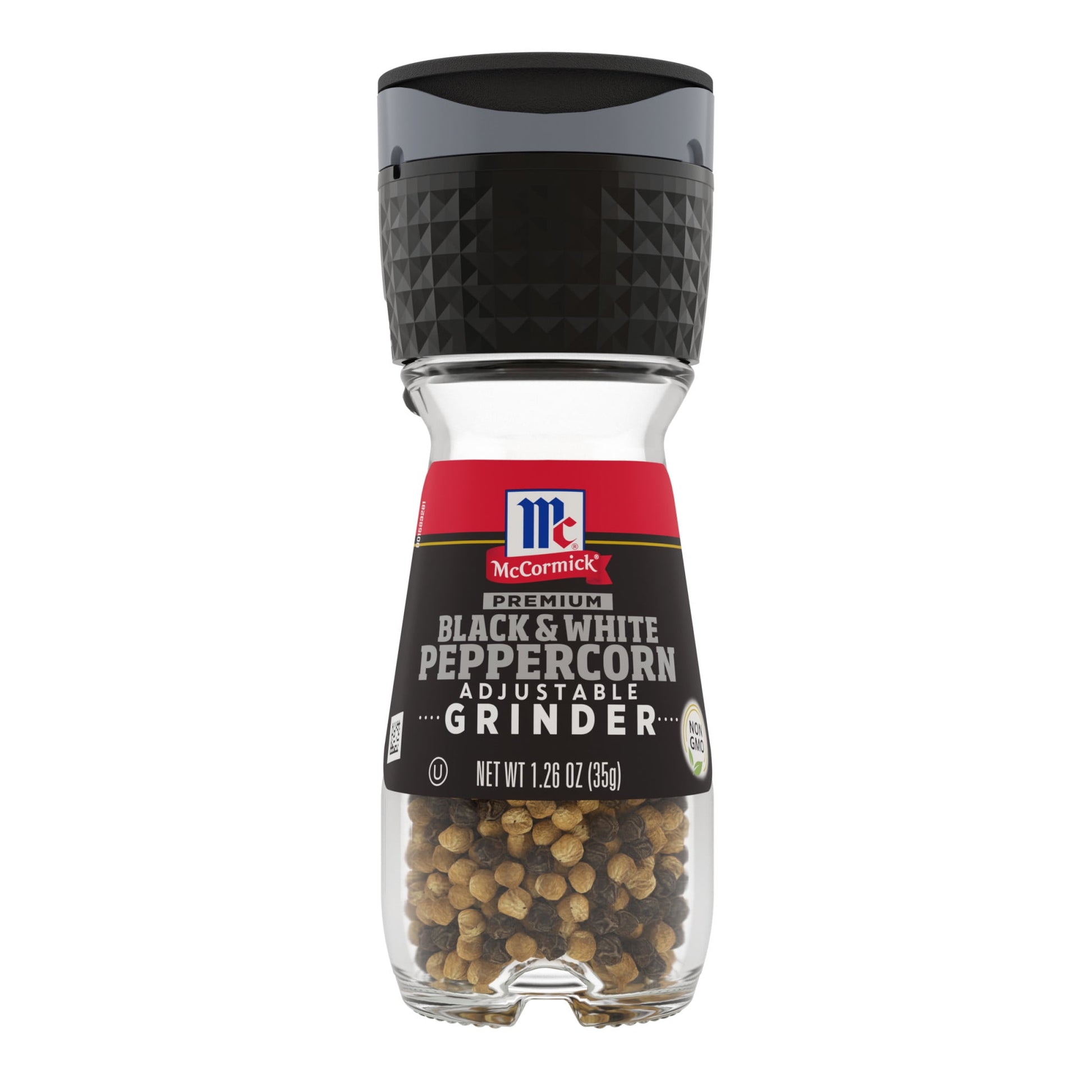 A must-have kitchen staple, this easy-twist pepper grinder lets you enjoy not one, but two peppery flavors – white and black pepper! The woody spice of black pepper is expertly balanced by the earthy, milder heat of white pepper to complement everything from salads and pizza to grilled or roasted meats. McCormick® Premium Black & White Peppercorn Grinder offers whole peppercorns with an adjustable grinder to deliver perfectly cracked pepper to suit your taste or recipe. Choose coarse ground pepper to crust steaks or burgers. Adjust to finely ground pepper for sprinkling over pasta, soup, salads or vegetables. Keep this peppercorn medley along with a salt grinder in the kitchen, at the table or by the grill for freshly ground flavor anytime. This McCormick® Premium Black & White Peppercorn Grinder is in a Glass bottle that is 1.26 ounces. Store this shelf-stable item at an ambient temperature.
