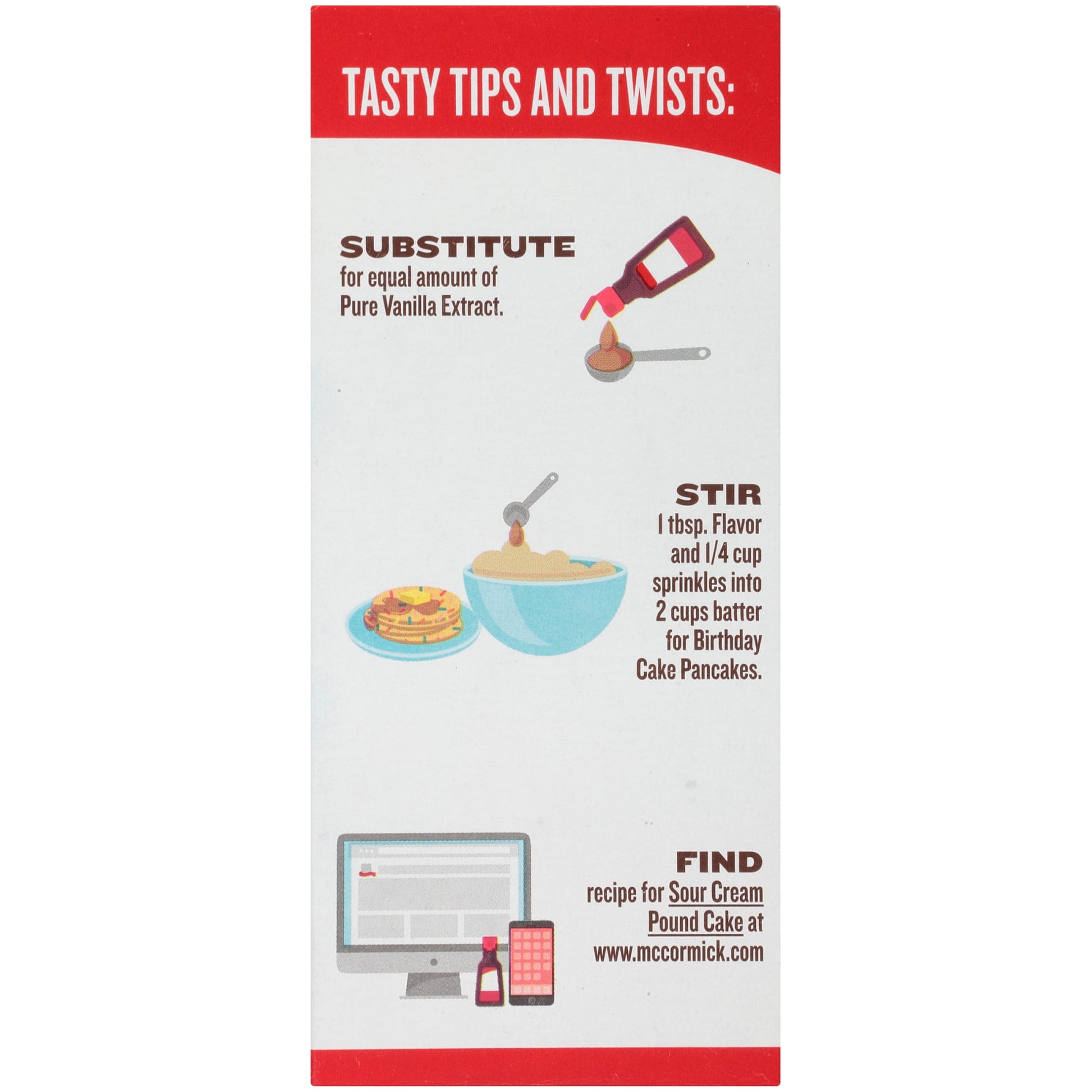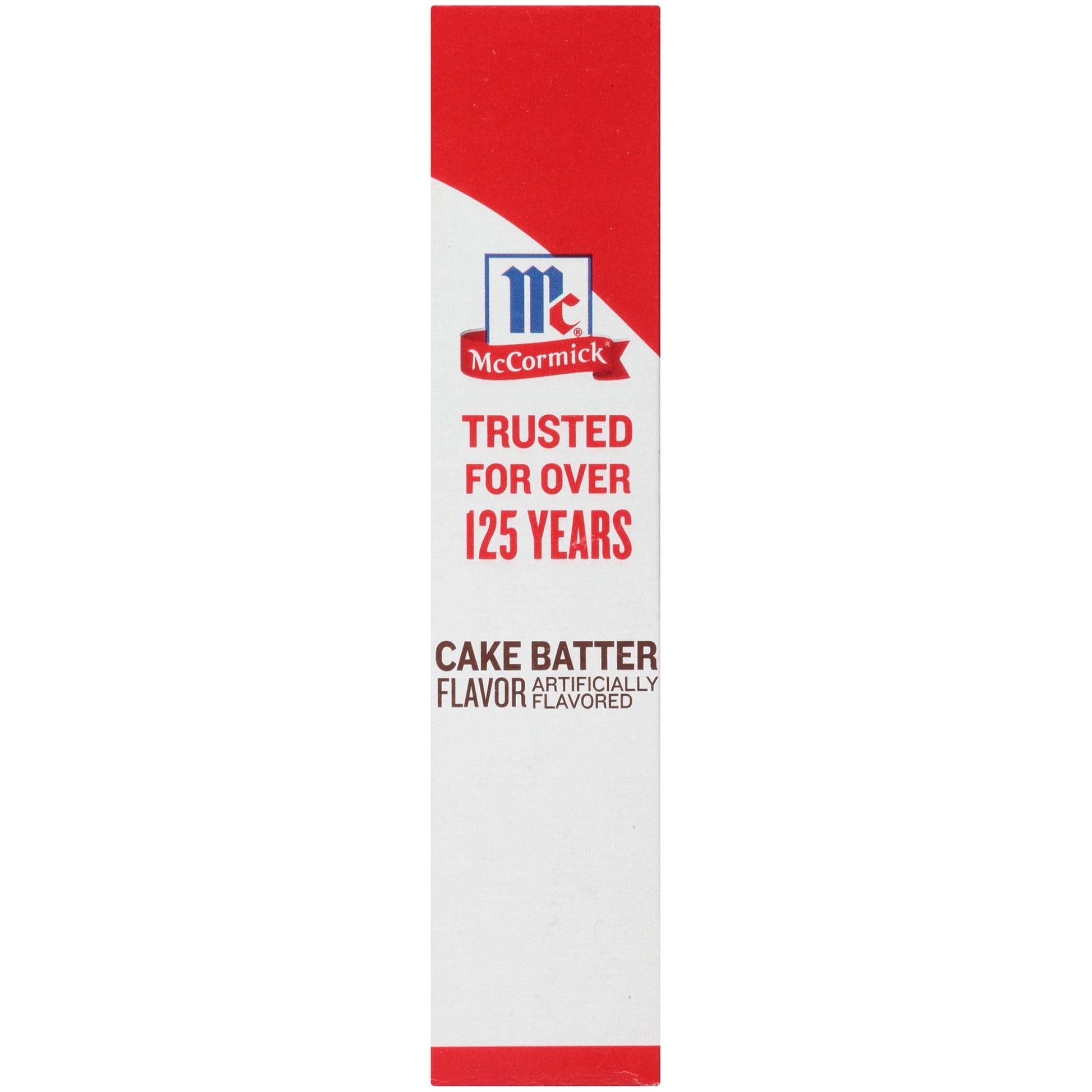 Everybody loves birthday cake! Recreate that classic, freshly baked cake taste with McCormick® Cake Batter Flavor. It imparts a rich bakery flavor in your favorite baked goods, like cookies and cupcakes. Bring new flavor dimension to your favorite treats. Our Cake Batter flavor can be substituted equal parts for McCormick Pure Vanilla Extract. Try it out in recipes for homemade ice cream, milkshakes … anywhere you want the great taste of birthday cake! This McCormick® Cake Batter Flavor is in a Plastic box that is 2 fluid ounces. Store this shelf-stable item at an ambient temperature.