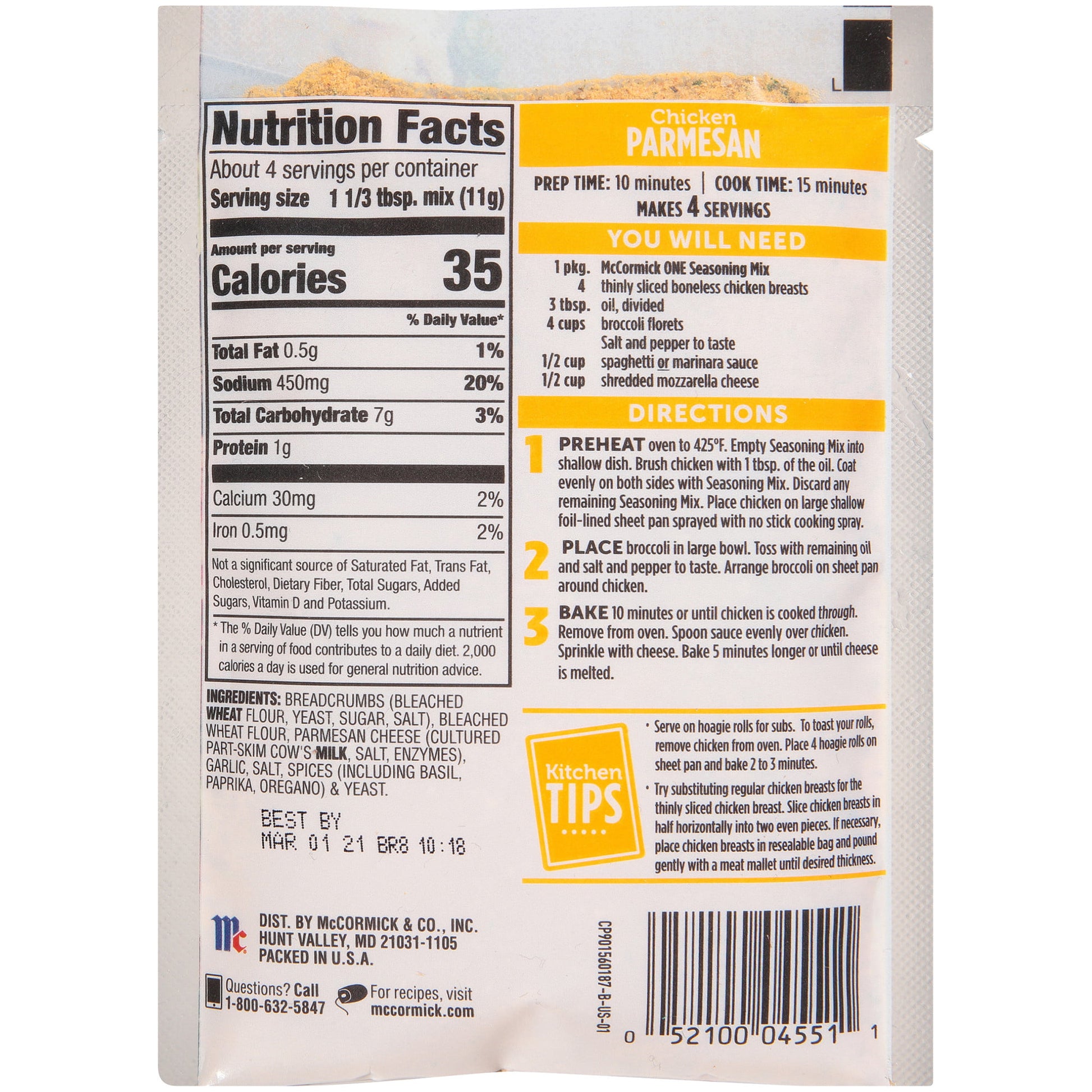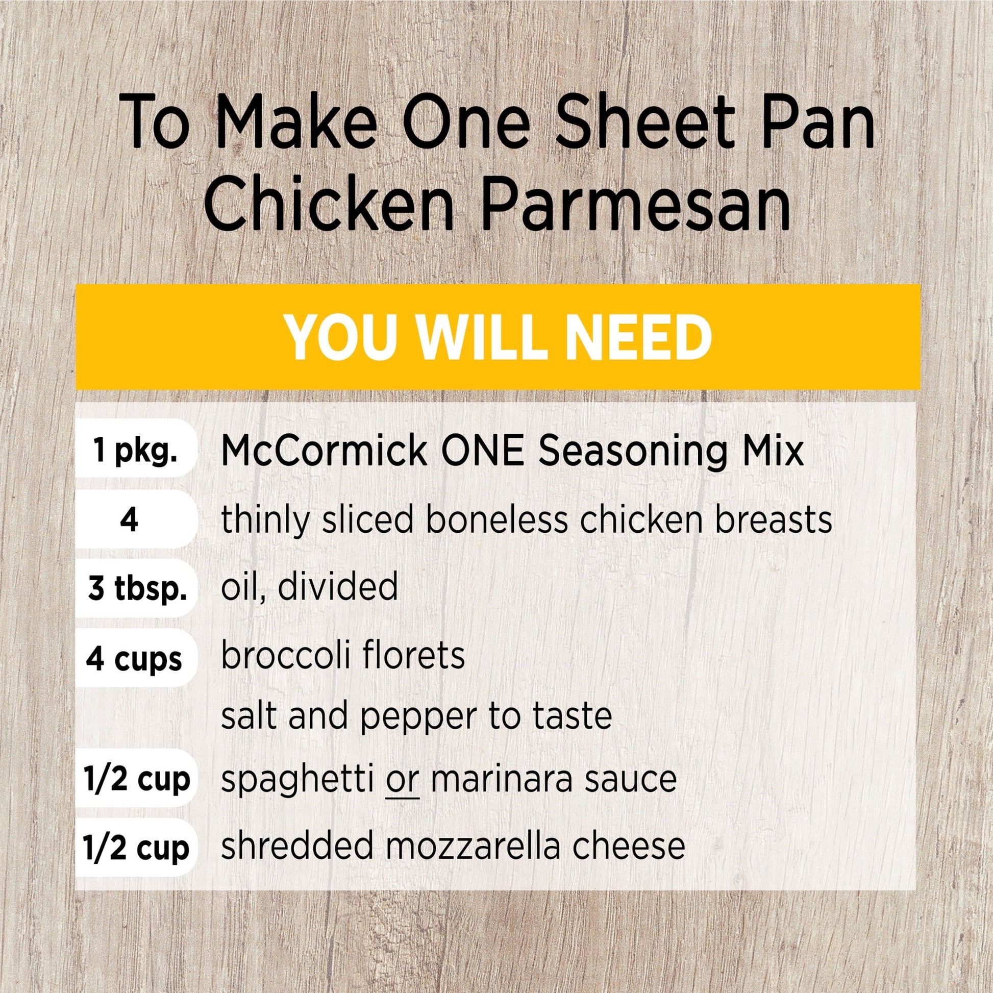 Take the work out of making Chicken Parmesan with McCormick One Sheet Pan Chicken Parmesan. This convenient seasoning has all the Italian flavors you love – basil, oregano and Parmesan cheese – with the bonus of easy clean-up. Here, chicken breasts are seasoned with a classic Italian seasoning mix before baking with your favorite veggies. With five minutes to go, top chicken with sauce and cheese and bake until melted. We use broccoli, but any sturdy roasting vegetable will do. To make this one-pan meal, you will need: McCormick ONE Seasoning Mix, boneless chicken breasts, oil, broccoli florets, salt, pepper, spaghetti or marinara sauce and shredded mozzarella cheese. This McCormick® Chicken Parmesan One Sheet Pan Seasoning Mix is in a Plastic packet that is 1.5 ounces. Store this shelf-stable item at an ambient temperature.
