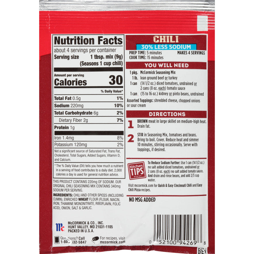 What's McCormick 30% Less Sodium Chili Seasoning Mix all about? Great tasting chili with less sodium! With 30% less sodium and no added MSG or artificial flavors, you can feel good about serving your family the best. It's blended with McCormick spices, including chili pepper, onion and garlic. Mix with your favorite beef or turkey chili recipe for a quick weeknight meal that will have the whole table craving seconds. This McCormick® Less Sodium Chili Seasoning Mix is in a Paper packet that is 1.25 ounces. Store this shelf-stable item at an ambient temperature.
