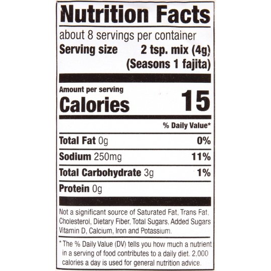 For restaurant-quality fajitas, add our McCormick Fajitas Seasoning Mix to your homemade dish. Infuse steak or chicken with flavors of cumin, chili pepper and garlic, with a hint of lime juice for a quick, authentic southwestern-flavored meal any night of the week. Just mix 1 package to 1 pound of meat. For a southwestern twist on burgers, mix one package per one and a half pounds of ground beef for fajita-style burgers the whole family will love. Made with McCormick spices and no MSG added (*except those naturally occurring glutamates), you’ll always be giving them the very best. This McCormick® Fajita Seasoning Mix is in a Paper packet that is 1.12 ounces. Store this shelf-stable item at an ambient temperature.