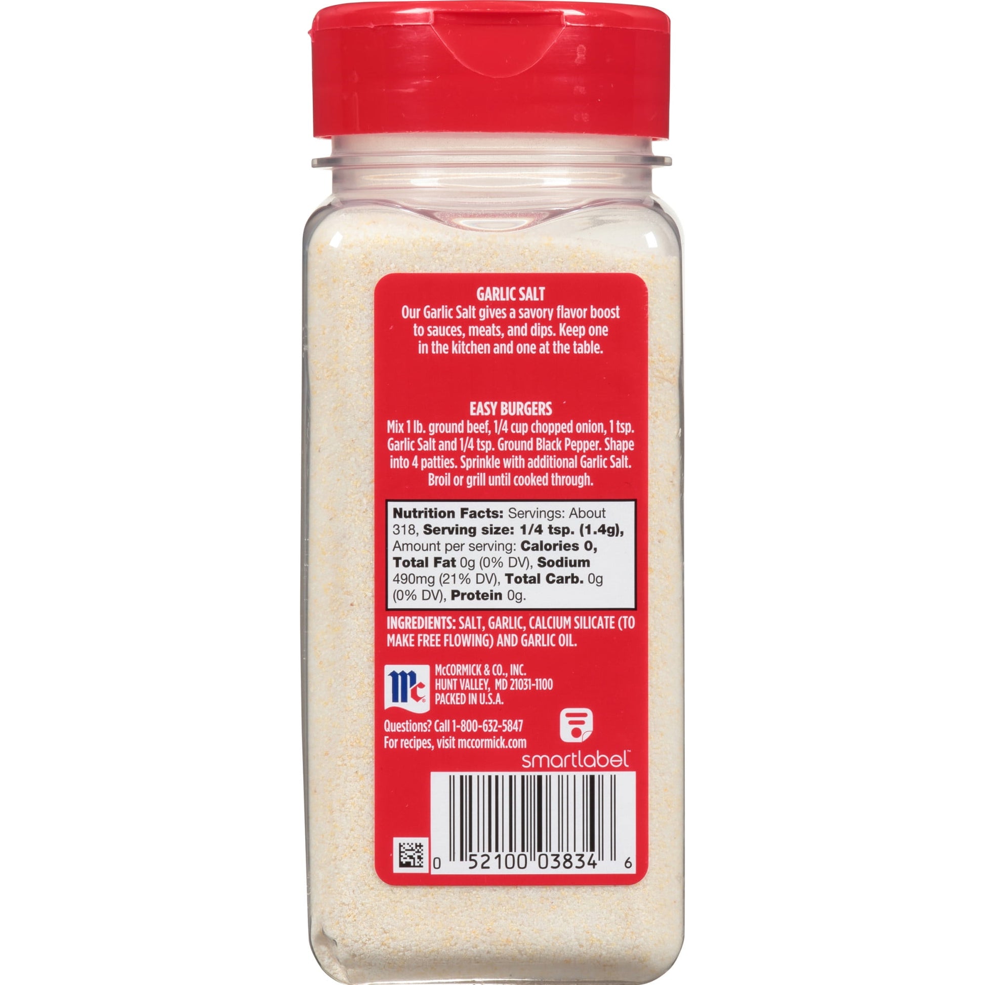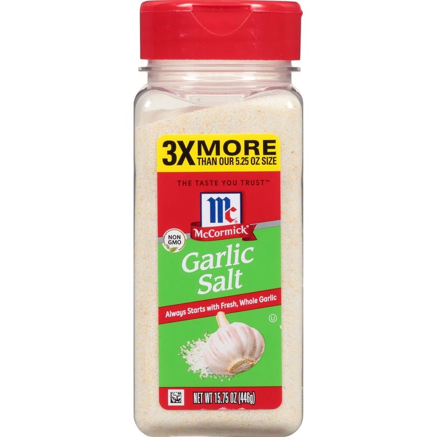 McCormick Garlic Salt is an instant flavor booster that savvy cooks count on in the kitchen. It’s delicious in stir-fries, sauces, casseroles, soups, stews and marinades. We start with whole heads of fresh garlic, which are dried and ground before blending with a touch of garlic oil and pure salt. The drying process mellows the flavor of raw garlic and adds a subtle sweetness. The result is a savory seasoning for meat, chicken or seafood. It also makes a great base for dry rubs for barbecued ribs or steaks. Add garlic salt to dips, potatoes, vegetables, pasta, eggs, dressings, salsas and more. Use as an all-purpose seasoning anywhere you’d use regular salt and want to punch up the flavor. Keep one by the stove and one at the table. This McCormick® Garlic Salt is in a Plastic bottle that is 15.75 ounces. Store this shelf-stable item at an ambient temperature.