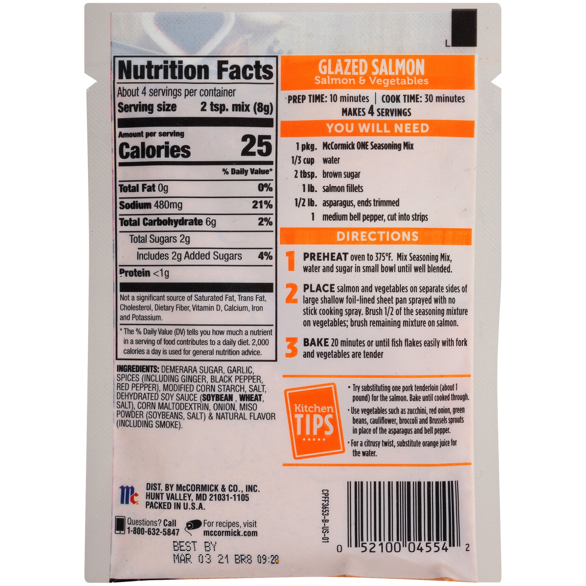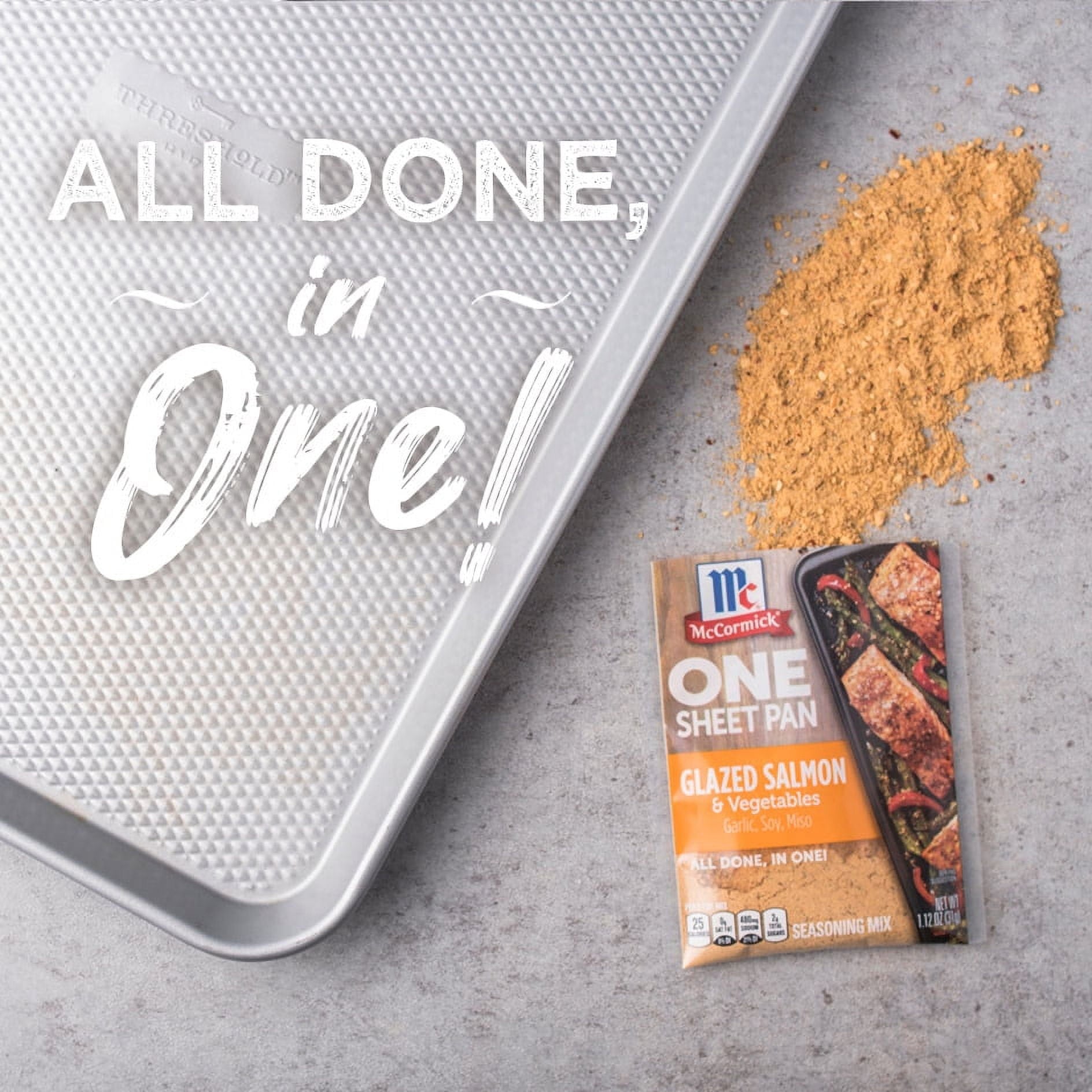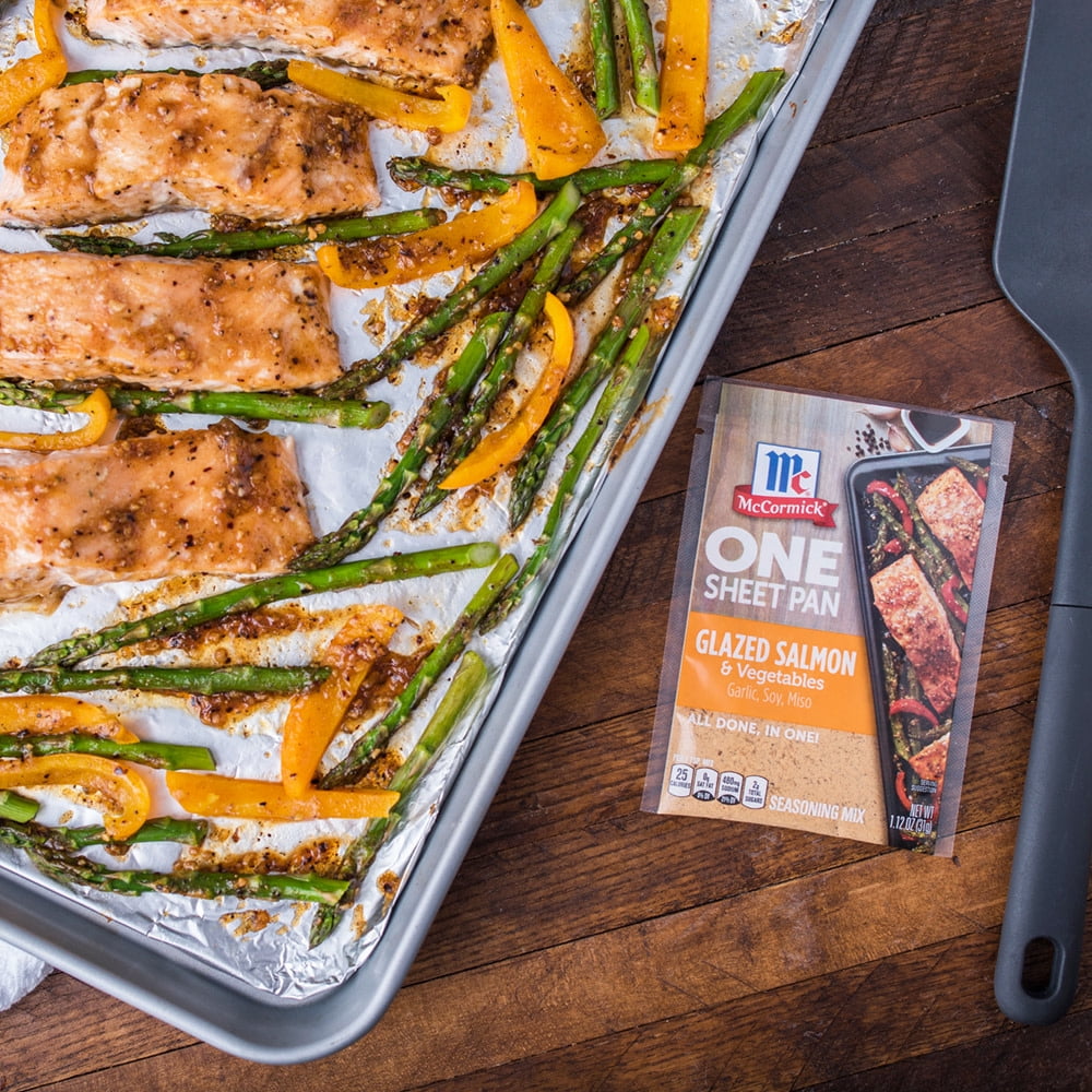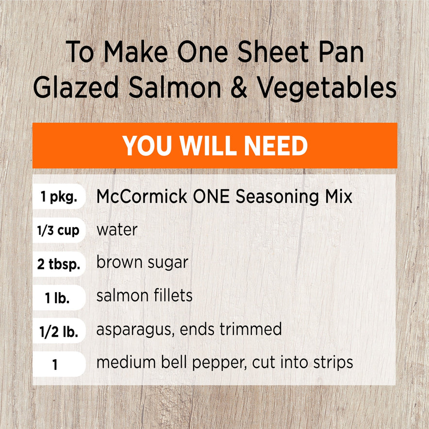 Salmon on a weeknight? Totally doable, with a little help from McCormick One Sheet Pan Glazed Salmon. The sweet, savory combination of soy and miso will have you adding this sheet pan meal to your regular recipe round-up in no time. And, bonus. It’s as easy to prep as it is to clean-up! Unsure about fish? Try this spice mixture with pork tenderloin. If you want to dial up the flavor even more, we recommend swapping orange juice for water for a citrusy punch. To make this one-pan meal, you will need: McCormick ONE Seasoning Mix, water, brown sugar, salmon fillets, asparagus and bell pepper. This McCormick® Glazed Salmon & Vegetables One Sheet Pan Seasoning Mix is in a Plastic packet that is 1.12 ounces. Store this shelf-stable item at an ambient temperature.