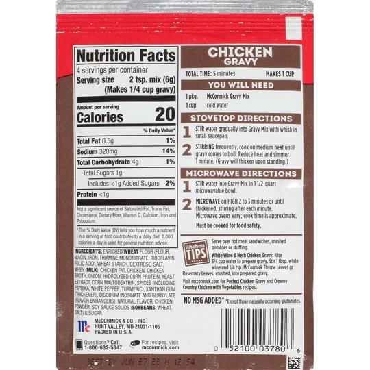 For holidays or every day, McCormick Chicken Gravy Seasoning Mix makes delicious homemade gravy that’s sure to be a hit with everyone at the table. Our hearty gravy is ready to pour over chicken, mashed potatoes and stuffing in just 5 minutes.Smooth, savory gravy is a snap to prepare- simply stir 1 pkg. mix and 1 cup water in a saucepan and simmer for 1 minute. It’s perfect for weeknight baked chicken or hot chicken or turkey sandwiches. Also great as a recipe starter for pot pies and casseroles. Our Gravy Mix is made with McCormick spices and contains no artificial flavors or added MSG*, so you can drizzle it over chicken, turkey and side dishes knowing you're serving your family the very best. *Except those naturally occurring glutamates. This McCormick® Chicken Gravy Mix is in a Plastic packet that is 0.87 ounces. Store this shelf-stable item at an ambient temperature.