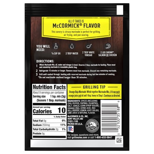 Backyard barbecues just got juicier and more delicious with McCormick Grill Mates Baja Citrus Marinade. This tangy marinade seasoning features a blend of Mexican flavors like citrus, garlic, chili pepper and cilantro, perfect for your next fiesta or family get together. Simply combine one marinade packet with ¼ cup vegetable or olive oil, 2 tablespoons water and vinegar with your choice of seafood and chicken. This McCormick® Grill Mates® Baja Citrus Marinade Mix is in a Plastic packet that is 1 ounces. Store this shelf-stable item at an ambient temperature.