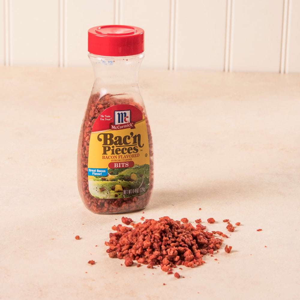 Bacon Flavored Bits are made from flavored textured soy flour to imitate the flavor and crunchy texture of bacon bits. So versatile- they make a great topper for a baked potato, green salads, pasta dishes and so much more. McCormick Bac’n Pieces Bacon Flavored Bits deliver delicious meaty bacon taste to dishes like pasta and potato salads, casseroles and chowders. Make all your party foods full of flavor by sprinkling on dips, pizzas, tacos, deviled eggs and potato skins. Our Bacon Flavored Artificially Flavored Bits contain no added MSG and are made from soy flour, making them the perfect meat-free alternative for vegetarian and vegan dishes. This McCormick® Imitation Bacon Bits is in a Plastic bottle that is 4.4 ounces. Store this shelf-stable item at an ambient temperature.