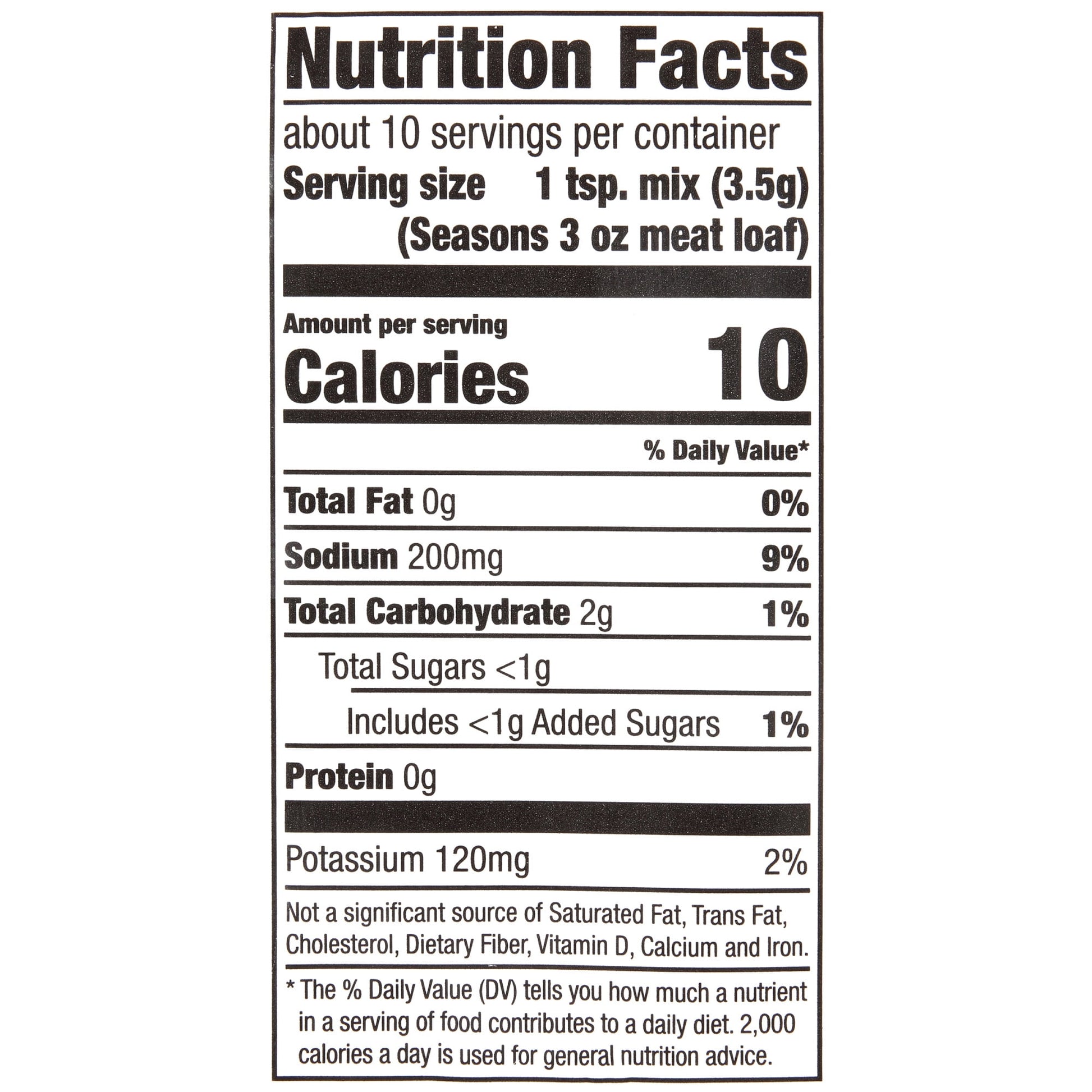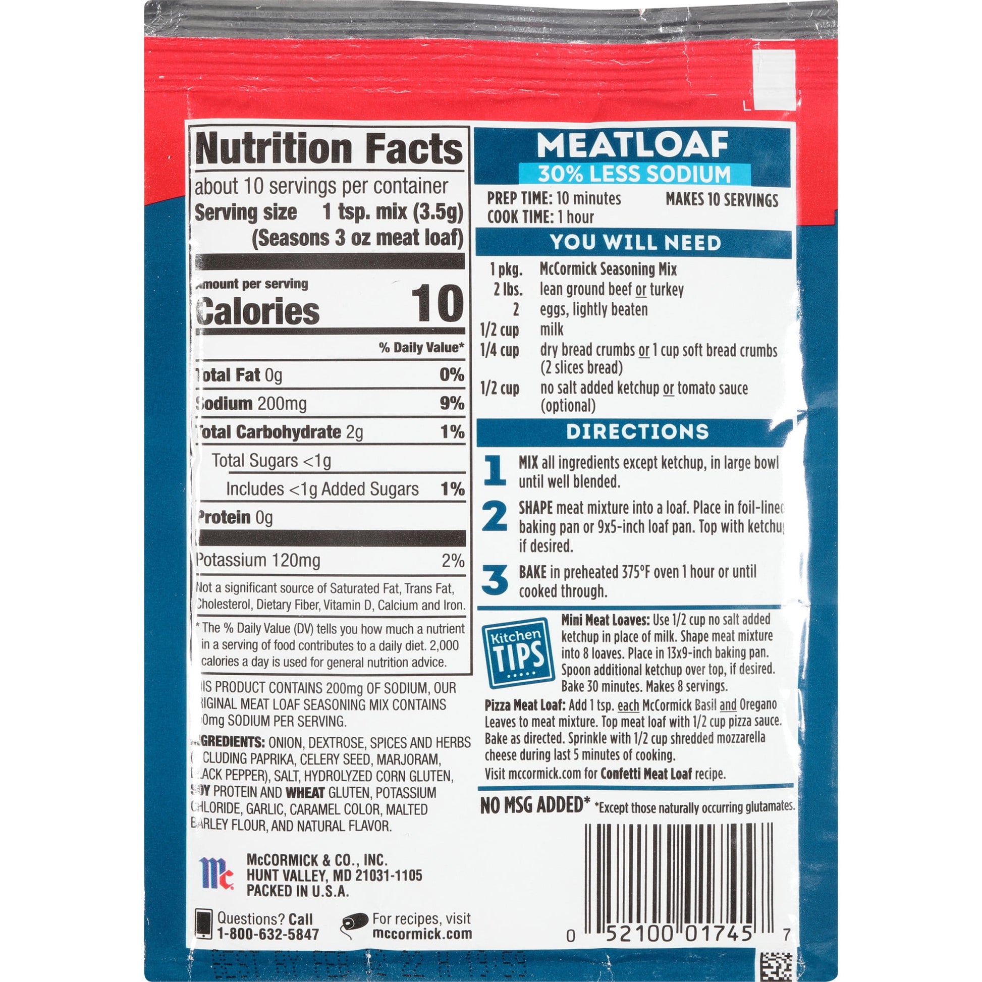 McCormick 30% Less Sodium Meat Loaf Seasoning Mix is the secret ingredient to hearty, home-style meat loaf. Made with McCormick herbs & spices, no artificial flavors or added MSG*, and 30% less sodium than our original meat loaf mix!Our expert blend of onion, garlic and herbs & spices like paprika, celery seed and marjoram delivers a delicious upgrade to meat loaf. To prepare, simply mix your choice of ground beef or turkey, eggs, milk and bread crumbs, form into a loaf and bake. It offers a fresh take on a classic meal that will have your family asking for seconds. Visit mccormick.com for kid-friendly recipe twists like Pizza Meat Loaf or Mini Meat Loaves, with just a 30-minute bake time.*Except those naturally occurring glutamates. This McCormick® 30% Less Sodium Meat Loaf Seasoning Mix is in a Paper packet that is 1.25 ounces. Store this shelf-stable item at an ambient temperature.