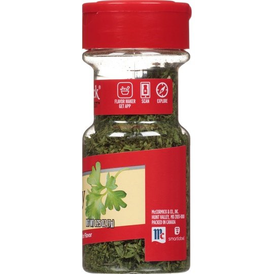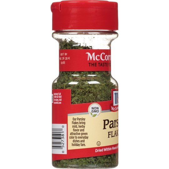 McCormick Parsley Flakes bring mild, herby flavor and attractive color to everyday dishes and holiday fare. Our Parsley Flakes are dried within hours of harvest so that they retain their characteristic parsley flavor and green color. What wouldn’t benefit from a sprinkling of parsley? It lends the perfect sprinkle of color for everything from scrambled and deviled eggs to potatoes, noodles and carrots. In addition to its use as a garnish, parsley also offers mild, herby flavor that doesn’t overpower the tastes of foods like chicken, seafood, pasta and vegetables. Add parsley flakes to seasoning blends, breading mixes, and herbed butters and sauces. Use 1 tsp. Parsley Flakes in place of 1 Tbsp. chopped fresh parsley. This McCormick® Parsley Flakes is in a Plastic bottle that is 0.25 ounces. Store this shelf-stable item at an ambient temperature.