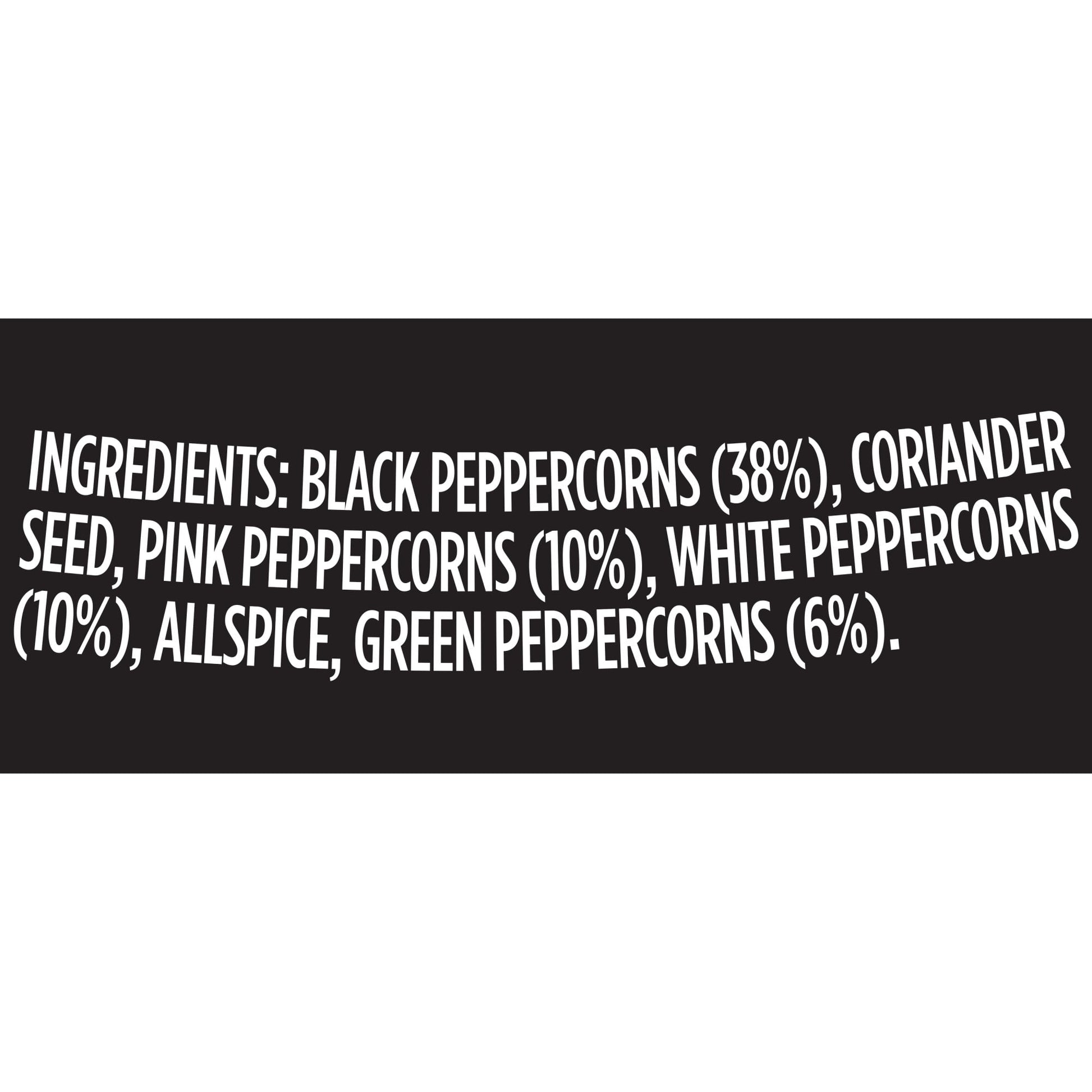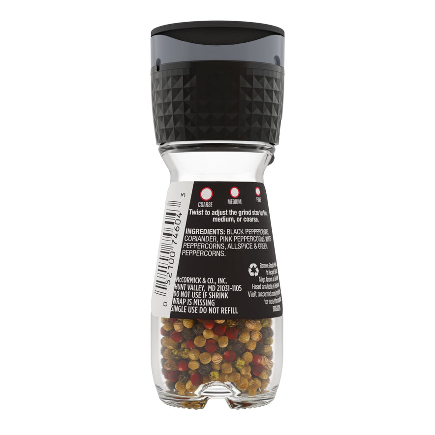 McCormick® Peppercorn Medley Grinder is a colorful blend of black, white, green and pink peppercorns, with whole allspice and coriander. The built-in adjustable grinder offers a coarser grind for seasoning meats or a finer grind for dishes like stews, vegetables or eggs. Our whole peppercorn and spice medley brings unique flavor and color to your favorite dishes. It adds contrasting sharp and mild heat from the peppercorns and complex spice notes from allspice and coriander. A simple turn of the red tab adjusts the grinder from coarse ground to finely ground pepper. Then turn upside down and twist over everything from grilled meats to pastas and salads. Keep in the kitchen, at the table or by the grill for freshly ground flavor anytime. This McCormick® Peppercorn Medley Grinder is in a Glass bottle that is 0.85 ounces. Store this shelf-stable item at an ambient temperature.