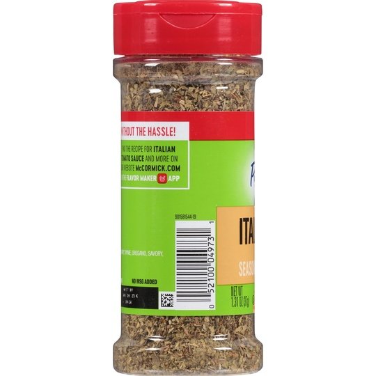 Welcome the beloved flavors of Italy into your kitchen with a shake of McCormick Perfect Pinch Italian Seasoning. Made with real McCormick herbs, it’s a classic blend of aromatic marjoram, basil, rosemary, thyme, oregano and other herbs. Create convenient, memorable meals by stirring Italian Seasoning into marinara sauce or sprinkling on chicken, pork or shrimp. Shake on pizza, pasta and other Italian recipes to give them more authentic flavor. Even salads and veggies are irresistible with a sprinkle of this Perfect Pinch seasoning. Made without added MSG, you can feel good about adding Italian Seasoning to your family’s favorite dishes. For fail-proof flavor, without the hassle, it comes in a convenient bottle with a flip-top for easy dispensing. This McCormick® Perfect Pinch® Italian Seasoning is in a Plastic bottle that is 1.31 ounces. Store this shelf-stable item at an ambient temperature.