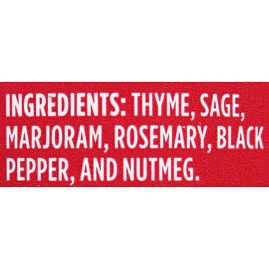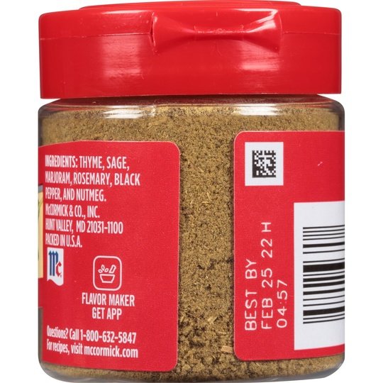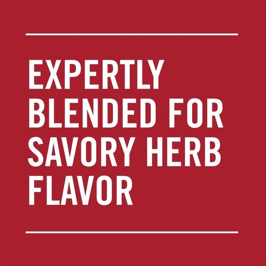 Expertly blended for savory herb flavor, McCormick Poultry Seasoning is a mix of thyme, sage and other herbs and spices. Its bold herby flavor is perfect for poultry, holiday stuffing and gravy. This appealing seasoning blend adds nuanced depth to so many chicken dishes, including roast chicken, fried chicken, pot pies, stews and chicken salad. It wouldn’t be a traditional Thanksgiving without a roast turkey or holiday bread stuffing seasoned just right with Poultry Seasoning. Its uses stretch beyond just poultry and holiday dishes. Add it to spice rubs and marinades for beef, pork, veal, roasted goose, and lamb. McCormick Poultry Seasoning can also be added to flavor veggie or meat burgers, meatloaf, Sunday roast and roasted vegetables. It adds rich, savory flavor to soups, gravies and casseroles. This McCormick® Poultry Seasoning is in a Plastic bottle that is 0.65 ounces. Store this shelf-stable item at an ambient temperature.