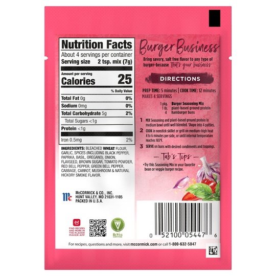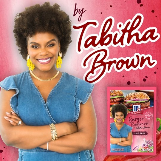 McCormick® Burger Business Seasoning Mix, created in partnership with Tabitha Brown, who brings joyful and full-of-flavor meatless recipe inspiration. Use this seasoning mix for savory, salt free flavor in any type of burger – because that’s your business. Tabitha Brown, our favorite vegan foodie, loves how these seasoning mixes make it easy to add meatless alternatives to your meals. With the Burger Business Burger Seasoning Mix, you simply add the mix to 1 lb. plant-based ground protein, form into veggie burger patties and cook in a skillet on or the grill. It’s made with McCormick herbs & spices like garlic, paprika, basil and oregano, along with veggies and natural hickory smoke flavor. Non-vegans can also use the seasoning mix to make ground turkey, ground chicken or ground beef hamburgers. This McCormick® Salt Free Burger Business by Tabitha Brown Seasoning Mix is in a Paper packet that is 1 ounces. Store this shelf-stable item at an ambient temperature.