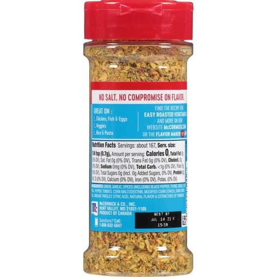 McCormick Salt Free Vegetable Seasoning will make your vegetables and salads the star of the meal. It’s a unique combination of savory ingredients like onion, garlic, tomato and red bell pepper, and real McCormick herbs and spices.Preparing low sodium meals does not mean that you have to sacrifice taste. Our Vegetable Seasoning contains no salt or added MSG* yet it does not compromise on flavor. Try our delicious recipe for Easy Roasted Vegetables and you will find your family reaching for a generous helping. This salt free seasoning is also great on chicken, fish, eggs, rice and pasta, as well as a veggie dip mix. It comes in a convenient bottle with a flip-top for easy dispensing. *Except Those Naturally Occurring Glutamates This McCormick® Salt Free Vegetable Seasoning is in a Plastic bottle that is 4.16 ounces. Store this shelf-stable item at an ambient temperature.