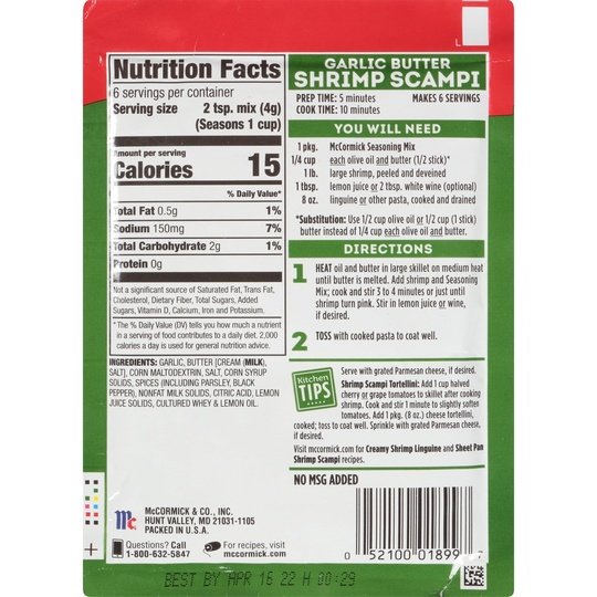 McCormick Garlic Butter Shrimp Scampi Mix is perfect for turning pasta into an experience you and your family will savor to the last bite. Warm garlicky-buttery sauce with shrimp and linguine. Just like you'd get at a restaurant. Sauté shrimp with this recipe mix and butter, and toss with pasta. McCormick Garlic Butter Shrimp Scampi Mix is perfect for turning pasta into an experience you and your family will savor to the last bite. And it's ready in fifteen minutes, so you won't have to wait long to chow down! Sauté shrimp as your sauce simmers, then pour over your choice of pasta, combine with shrimp, and enjoy! Made with no artificial flavors or MSG, you can feel good serving this meal. For a mature twist on this tasty classic, add two tablespoons of white wine. This McCormick® Garlic Butter Shrimp Scampi is in a Plastic packet that is 0.87 ounces. Store this shelf-stable item at an ambient temperature.