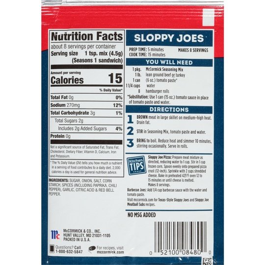 McCormick Sloppy Joes Seasoning Mix has no artificial flavors or added MSG