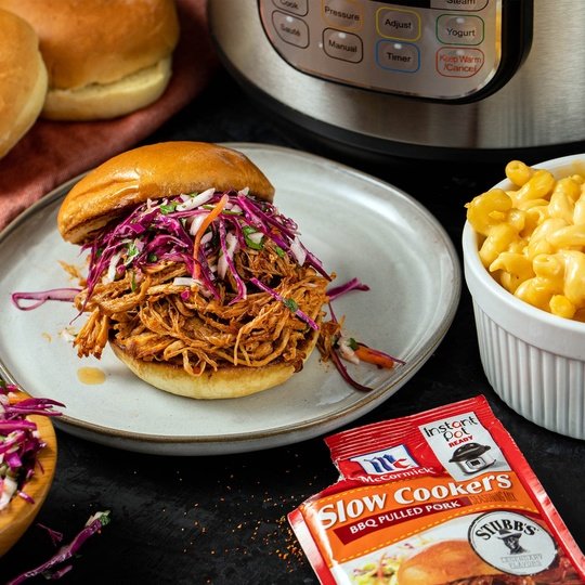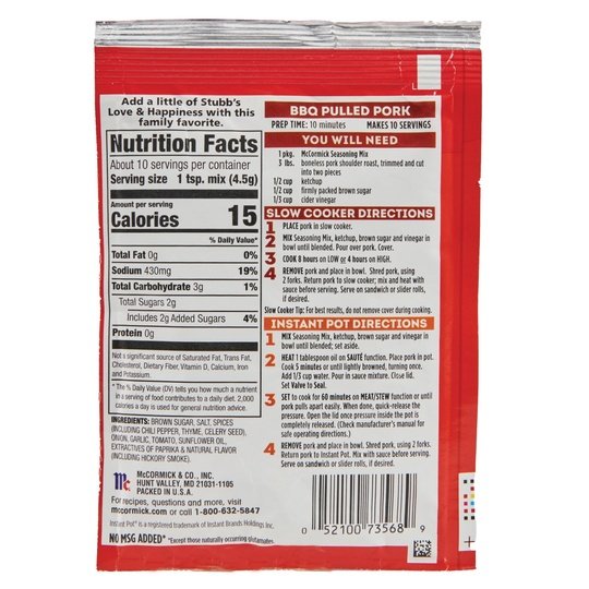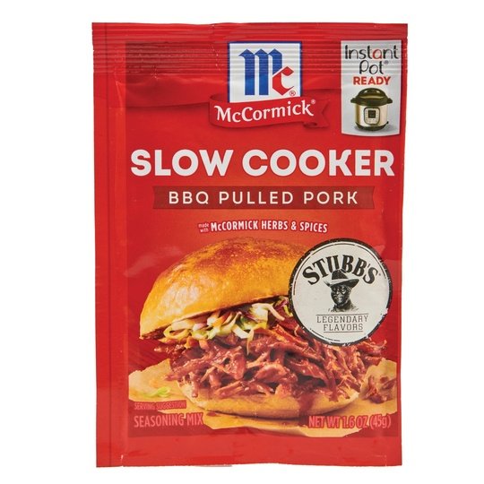 A sweet and tangy blend of brown sugar, garlic and chili pepper, McCormick Barbecue Pulled Pork Slow Cooker Seasoning Mix offers an easy-to-prepare meal solution in your slow cooker or Instant Pot any night of the week.Craving pulled pork sandwiches? The expertly blended seasoning mix makes it easy. Just add mix, ketchup, brown sugar and vinegar to your slow cooker or Instant Pot with pork. Then, sit back and let your meal simmer to perfection. The result? Juicy pork, so tender you can shred with a fork, perfect for piling high onto rolls, or enjoying on its own with your favorite sides. Dinner with McCormick Slow Cooker truly is a breeze: 8 hours on low, 4 hours on high in your slow cooker, or 60 minutes in your Instant Pot.*Except Those Naturally Occurring Glutamates. This McCormick® Slow Cooker Barbecue Pulled Pork Seasoning Mix is in a Paper box that is 1.6 ounces. Store this shelf-stable item at an ambient temperature.