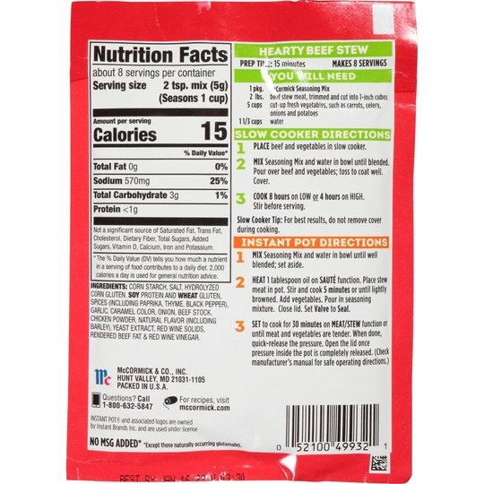 Beef stew – the ultimate comfort food – doesn’t get any easier than this! Reach for your slow cooker or Instant Pot and McCormick Hearty Beef Stew Slow Cooker Seasoning Mix (our tasty blend of black pepper, paprika and thyme) to create homestyle stew tonight.Made with herbs and spices, our expertly blended mix of black pepper, paprika and thyme intensifies the flavor of this hearty dish. Just trim and cut beef, chop up your choice of veggies like carrots and onions, and combine with seasoning mix and water in slow cooker, and stir until blended. Sit back and let your meal simmer to perfection. Dinner with McCormick Slow Cooker truly is a breeze: 8 hours on low, 4 hours on high in your slow cooker, or 30 minutes in your Instant Pot.*Except Those Naturally Occurring Glutamates. This McCormick® Slow Cooker Hearty Beef Stew Seasoning Mix is in a Paper packet that is 1.5 ounces. Store this shelf-stable item at an ambient temperature.