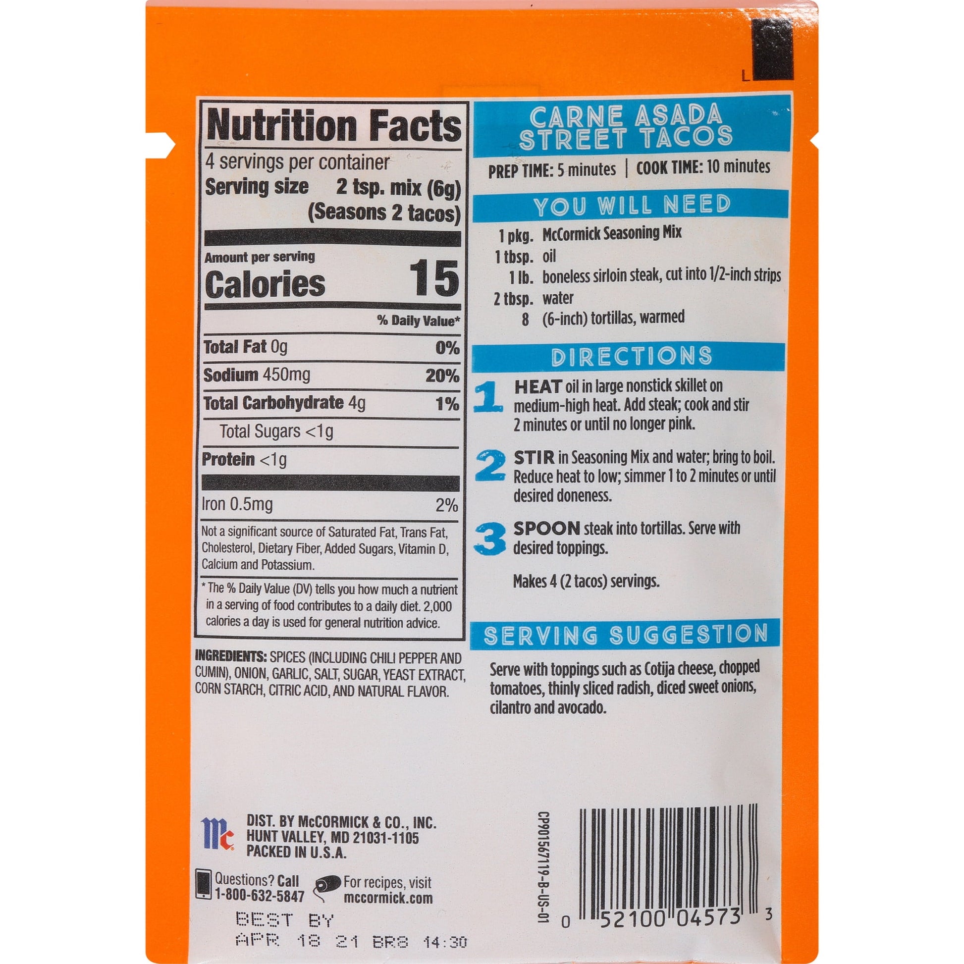 Serve up tender steak tacos full of authentic Mexican flavor with a little help from McCormick Street Taco Carne Asada Seasoning Mix. It’s a mouth-watering blend of chili pepper, cumin, onion and garlic, at-the ready to help you get food truck-style tacos on the table in 15 minutes. Looking for a new go-to on taco night? This carne asada seasoning is it. One packet has all the flavor you need to create tasty, like-restaurant tacos. Cook it up with sirloin steak strips in a skillet, then serve cooked meat in warm tortillas. Toppings like Cotija cheese, chopped tomatoes, thinly sliced radish, diced sweet onions, cilantro and avocado round out the family-friendly meal. This McCormick® Street Taco Carne Asada Seasoning Mix is in a Plastic packet that is 0.87 ounces. Store this shelf-stable item at an ambient temperature.