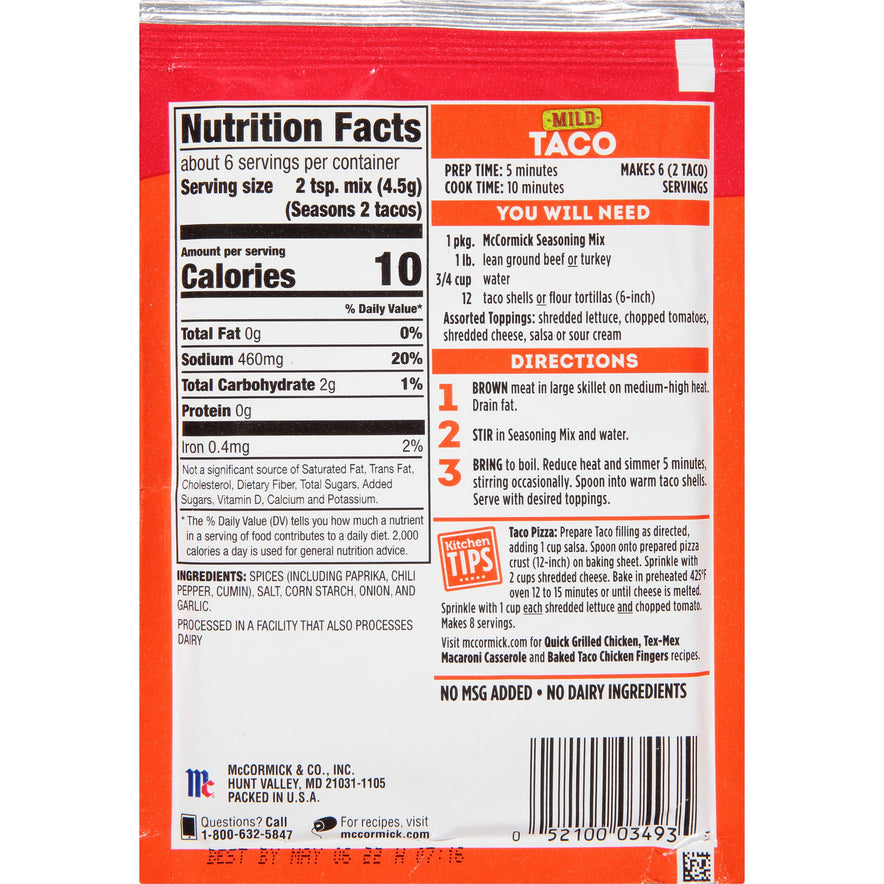 Turn tonight's meal in to a flavor-filled fiesta with McCormick Mild Taco Seasoning Mix. Bold south-of-the-border flavors, like paprika, chili pepper and cumin, create a mild heat that's perfect for seasoning ground meat. Sprinkle this convenient seasoning mix into rice, salads, burritos and more for family-friendly dinners any night of the week.*Except naturally occurring glutamates This McCormick® Mild Taco Seasoning Mix is in a Paper packet that is 1 ounces. Store this shelf-stable item at an ambient temperature.