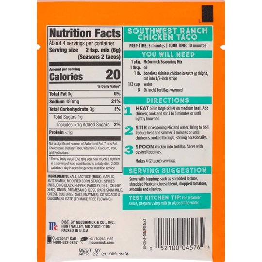 Tangy ranch flavor with a hint of garlic is everything homemade chicken tacos need. Made with McCormick Street Taco Southwest Ranch Chicken Seasoning Mix, a delicious family-style dinner can be on the table in 15 minutes. No food truck hunt required. Give Taco Tuesday a makeover with the craveworthy taste of ranch and a southwestern kick! It’s the perfect flavor boost for taco night. Combine with chicken strips in a skillet and serve in warm tortillas with your favorite toppers, like shredded lettuce, Mexican cheese, chopped tomatoes, avocado and cilantro. Best of all, dinner is ready in 15 minutes for the whole family to enjoy. This McCormick® Street Taco Southwest Ranch Chicken Seasoning Mix is in a Plastic packet that is 0.87 ounces. Store this shelf-stable item at an ambient temperature.