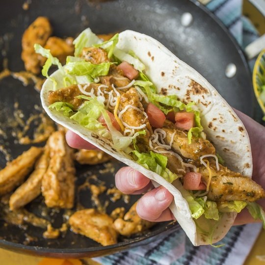 Serve seasoned chicken in warm tortillas with lettuce, tomato, avocado and cilantro